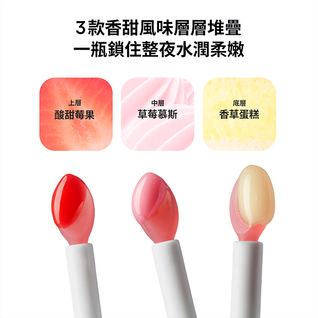 慕斯般輕盈質地,一抹即融於唇。可單獨享受分層甜味,也能混合疊擦,打造專屬的草莓奶油蛋糕保養體驗。