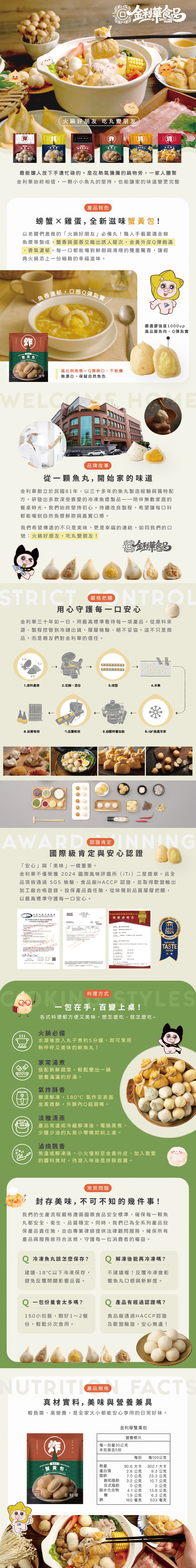 使用優質金線魚漿,內餡融合螃蟹風味與獨家雞蛋仔調味,打造香氣濃郁、風味獨特的美味口感。
