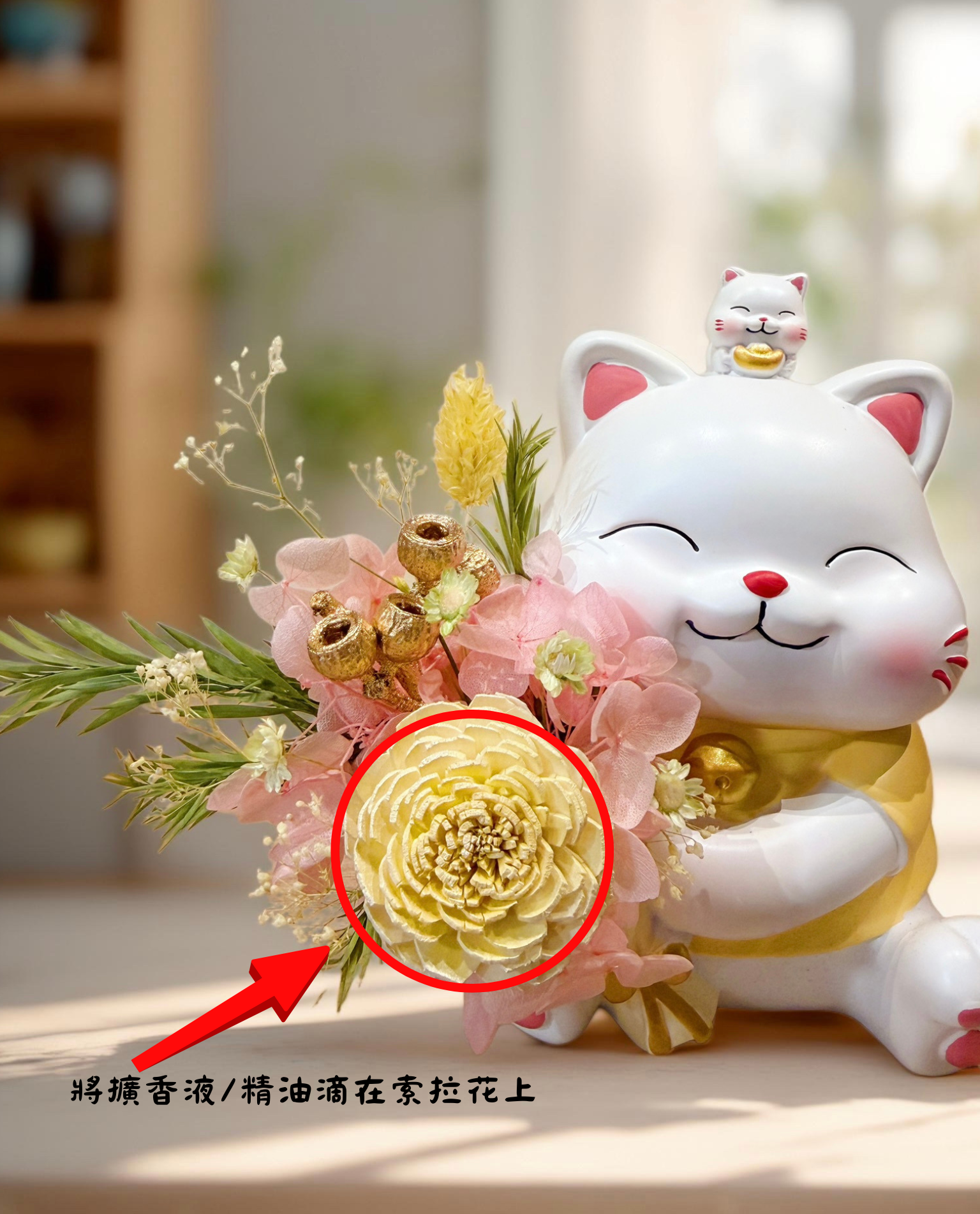 A:主花為索拉花,只要在主花滴上幾滴香水或擴香液,香氣就會隨著花瓣自然散發。