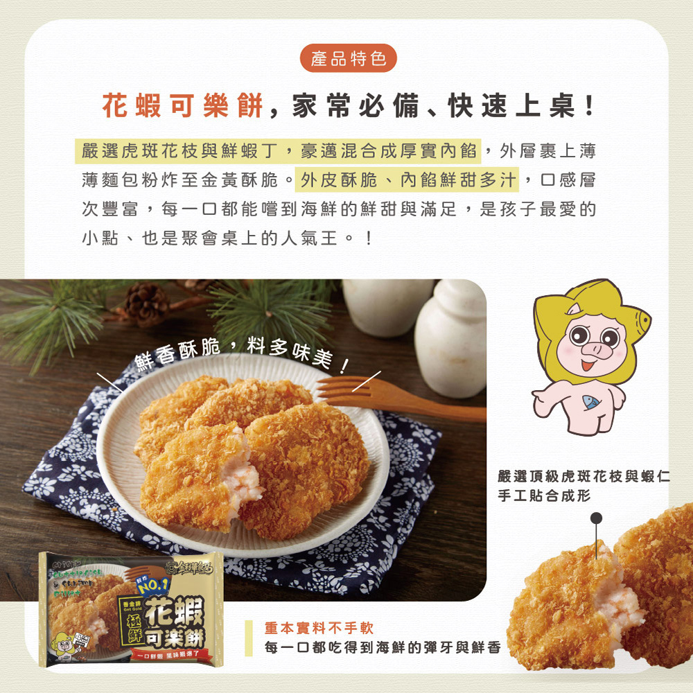 商品規格商品組合/規格:200g/包x6包商品品名:花蝦可樂餅商品重(容)量:200g/包x6包,共1200g內容物成分(如含有豬、牛成分請加註國別):蝦仁、花枝、麵包油炸粉[麵粉(小麥、L-抗壞血酸)、水、精製棕櫚油(棕櫚油、香料、混合濃縮生育醇(抗氧化劑)、鹽、黃豆粉、酵母、玉米澱粉、硫酸鈣、碳酸氫銨製劑(碳酸氫銨、碳酸鎂)、L-抗壞血酸(抗氧化劑)、酵母抽出物、精製椰子油]、豬背脂(台灣)、澱粉、糖、海藻糖、食鹽、胡椒粉 食品添加物:味精、多磷酸鈉、焦磷酸鈉、多磷酸鈉(六偏磷酸鈉)過敏原資訊:本產品含有頭足類、甲殼類、黃豆製品及含麩質製品,對此過敏或有特殊體質者,請避免食用。本產品與其它含有魚類、蛋類及奶類製品的產品,於同一工廠生產,對食物過敏者需斟酌食用。原產地(國):台灣保存期限:兩年(未開封狀態且在-18℃冷凍條件下)食用方式:油炸-產品無須解凍,熱油放入油鍋,以中火酥炸4~5分鐘至表面呈金黃色即可美味上桌。氣炸-預熱至110度無須解凍噴上些許橄欖油,平放勿堆疊置入氣炸鍋,以110度炸6分鐘再以180度炸8分鐘至表面呈金黃酥脆,即可美味開動!注意事項:非供即食,應充分加熱。解凍後請盡早食用,請避免重複冷凍再解凍,以免影響品質新鮮。