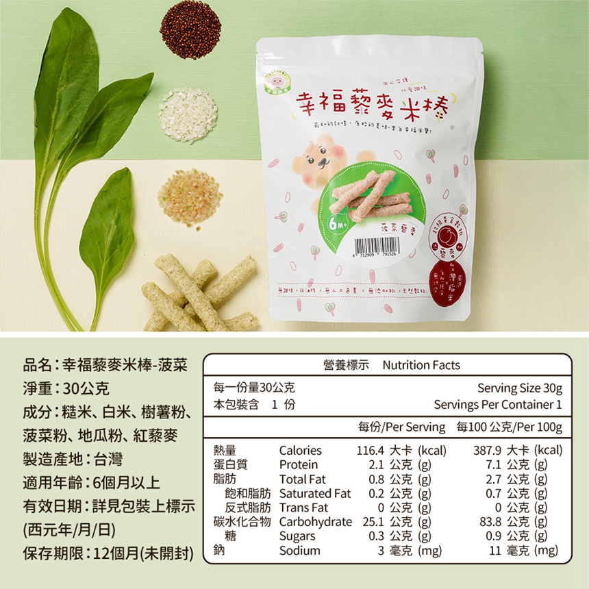 幸福藜麥米棒-菠菜:糙米、白米、樹薯粉、菠菜粉、地瓜粉、藜麥