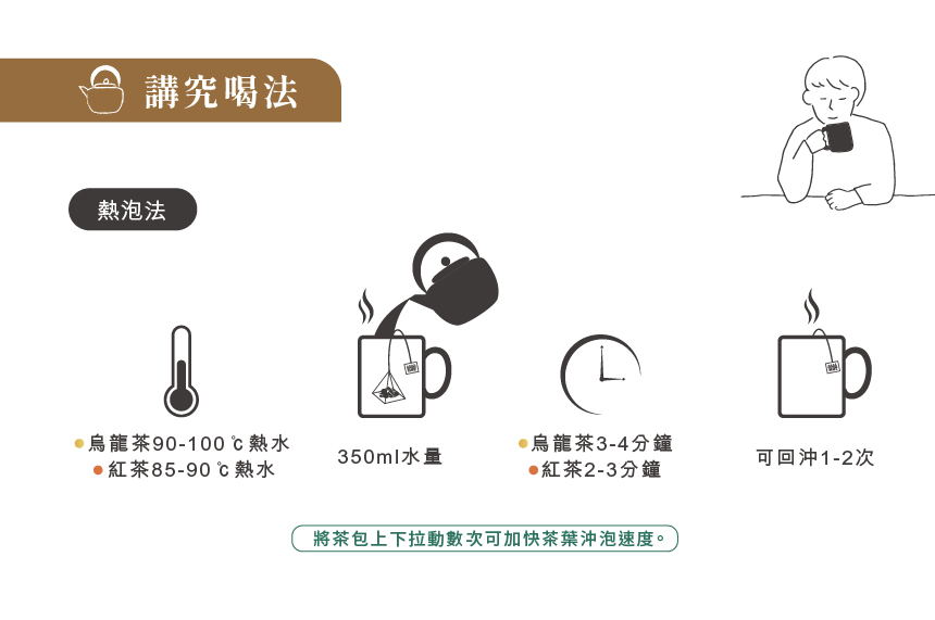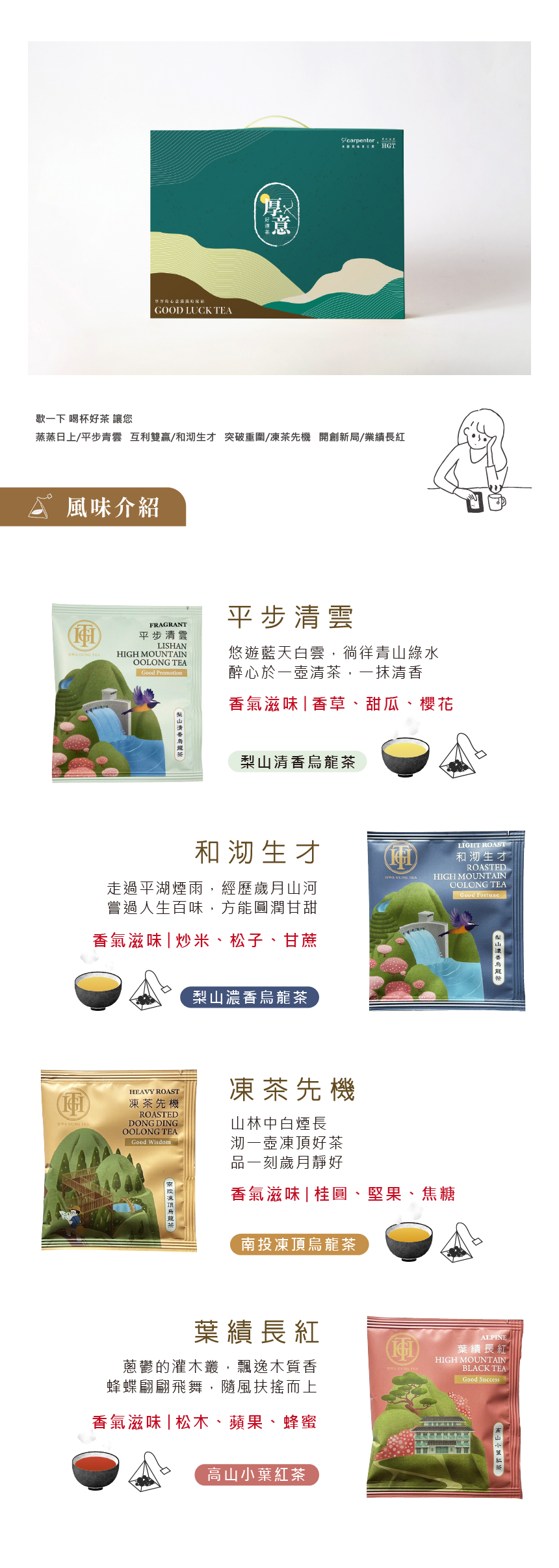 【商品內容】(1)商品品名:巡茶趣茶包﹝梨山清香烏龍茶、梨山濃茶烏龍茶、南投凍頂烏龍茶、高山小葉紅茶﹞商品淨重:24g(3g x 8包)商品成分:茶葉食品添加物名稱:無原產地:台灣