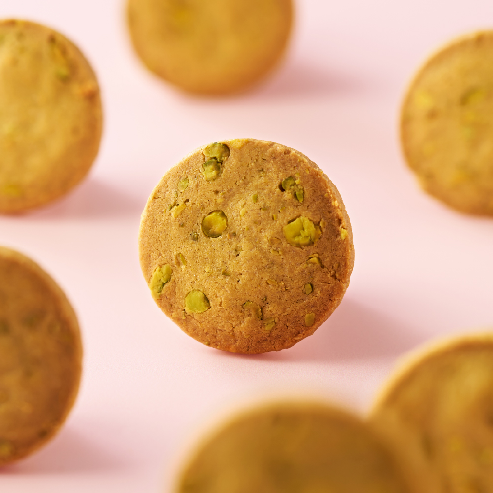 利用傳統法式沙布列混合方式製作,使餅身鬆化極致之餘,更提升義大利品牌開心果醬的柔滑及開心果香氣。