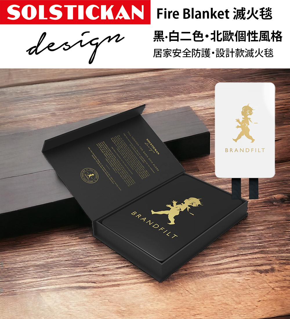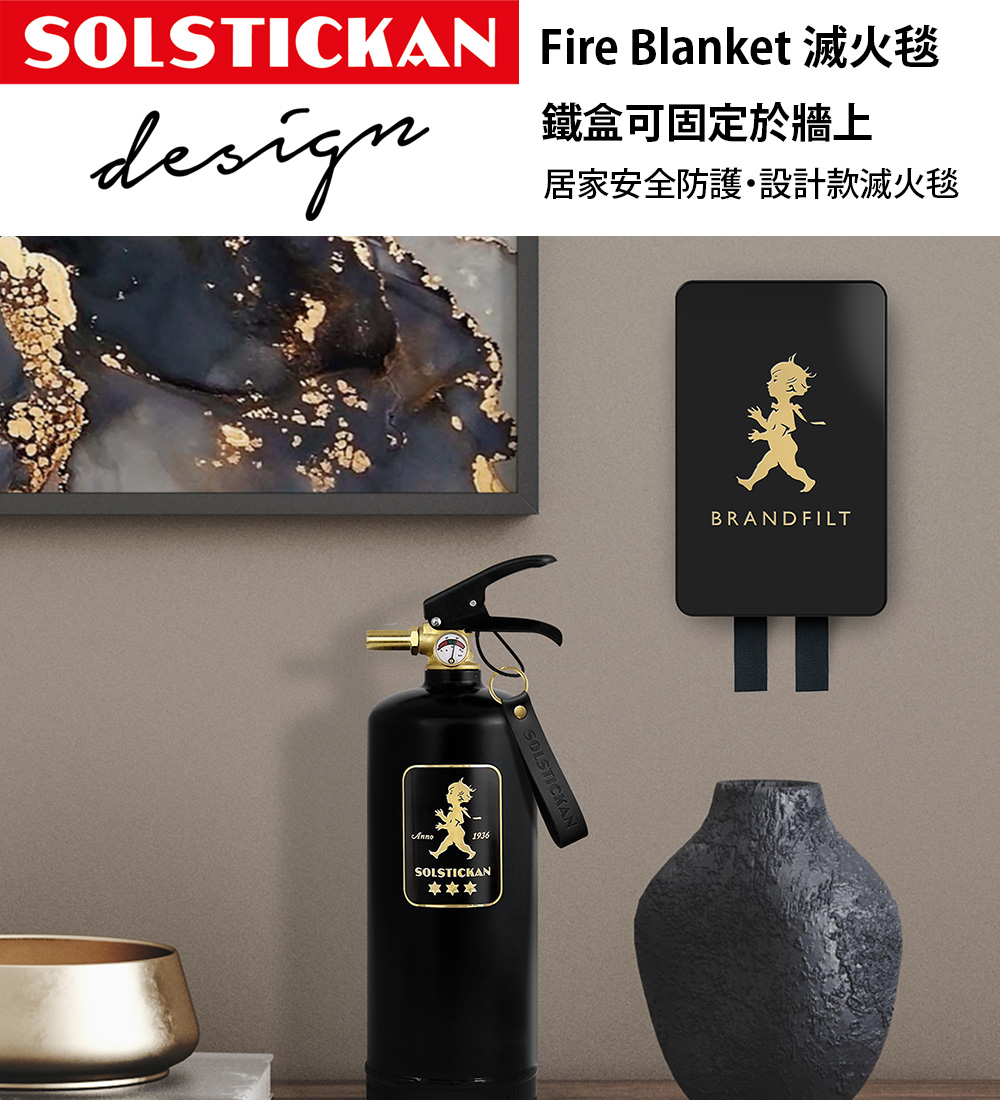 時尚鋼鐵盒中裝入居家安全必備的滅火毯,鐵盒上帶有經典的小男孩壓紋,適合放置廚房或居家空間的牆上。滅火毯本身由玻璃纖維製成,可承受高達 500 度的溫度。盒子背面有清晰的使用說明以及用於掛在牆上的孔洞,讓滅火毯成為居家安全守護的一部分。