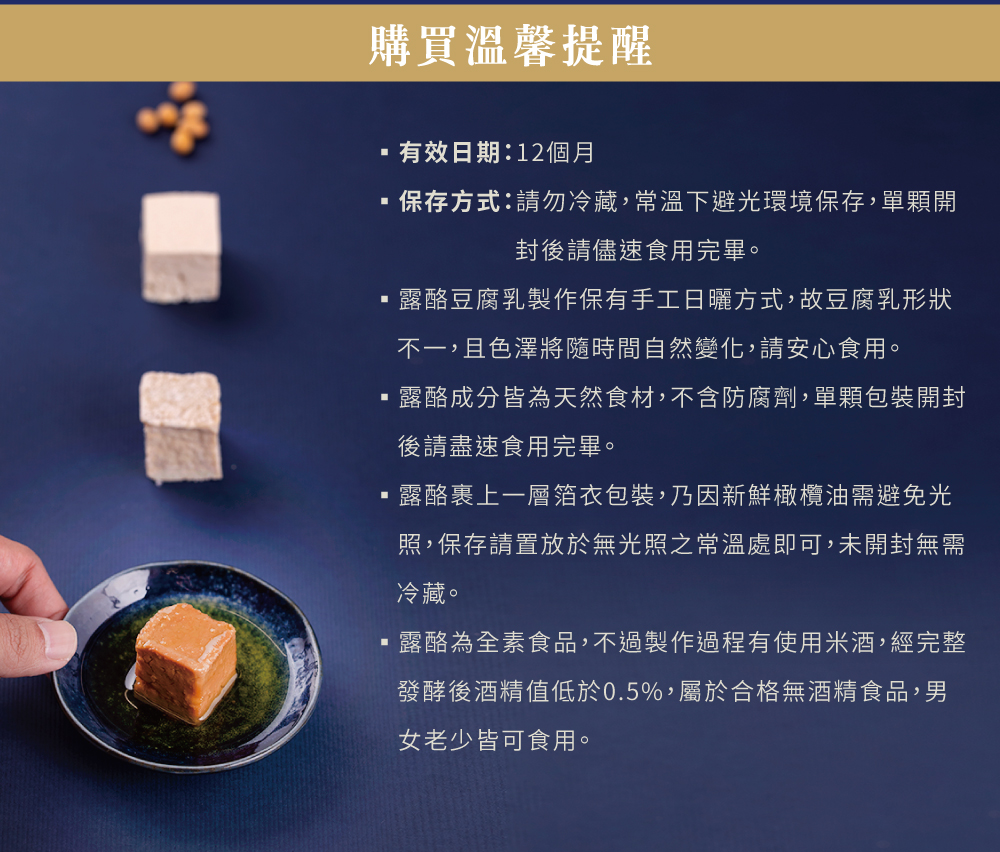 露酪來自宜蘭的精品級豆腐乳,結合健康減鹽的獨家配方與最新鮮的特級初榨橄欖油,醇香豐沛、絲滑綿密。手工日曬、精巧包裝,讓傳統美食跟上新時代,融入現代人的生活。不論搭配紅酒威士忌、佐生菜沙拉、抹早餐麵包,或拌入麵食料理,都能輕鬆享受食尚生活,精緻口感甚至媲美西式素食鵝肝醬,也是送禮自用兩相宜的高雅選擇,無論在台灣或出國,都能傳遞獨特東方美味與心意。