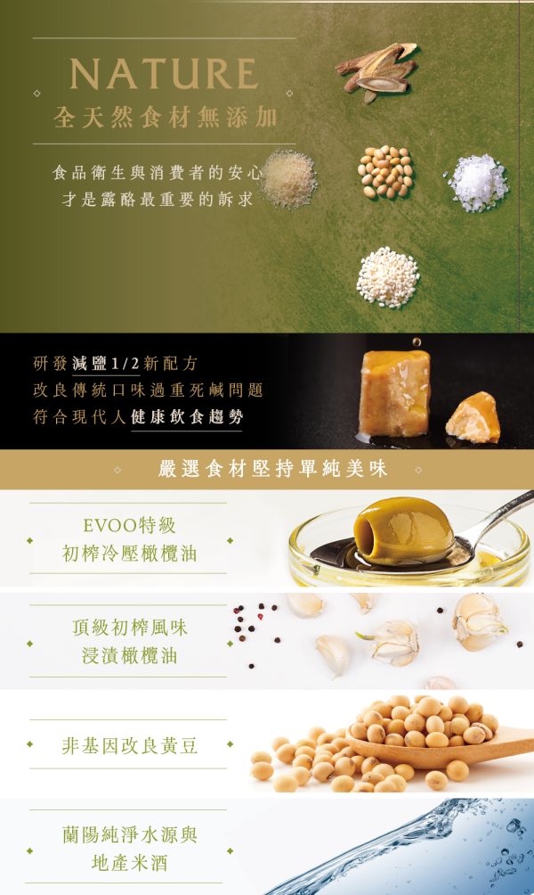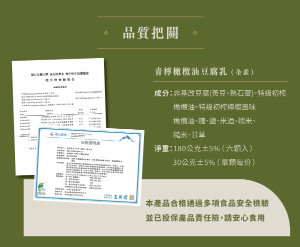 成分:非基改豆腐(黃豆、熟石膏)、特級初榨橄欖油、特級初榨檸檬風味橄欖油、糖、鹽、米酒、糯米、糙米、甘草