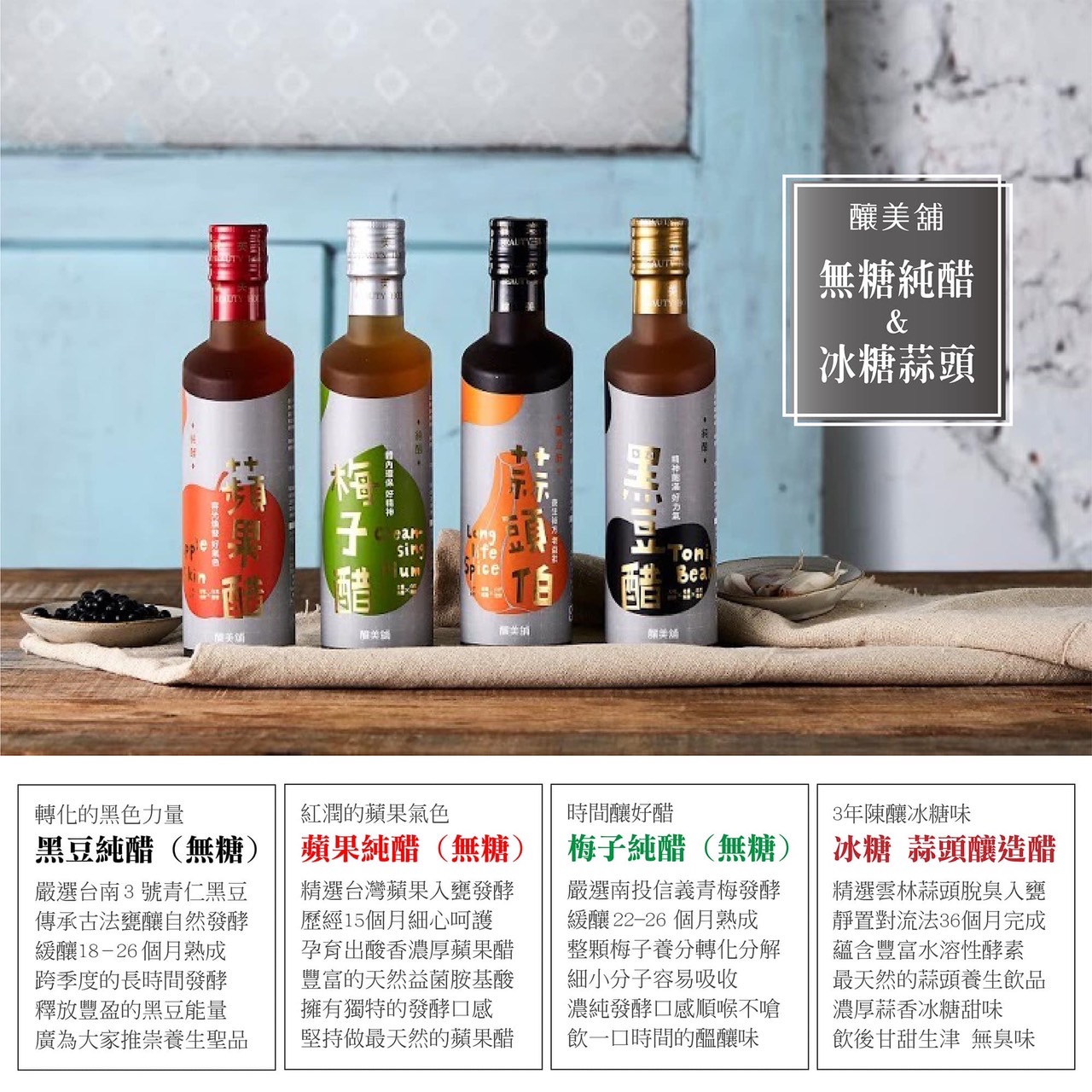 醋是現今的健康飲品,醋中含多種胺基酸和有機酸,對人體有非常多的益處。釀美舖堅持做最好的醋,精選台灣在地食材,並以熟成古法釀造,不做任何的人工催化、不植入任何醋酸菌種,果香溫潤,不嗆口,保有豐富有機酸和多酚,是您健康養生及送禮的好選擇!