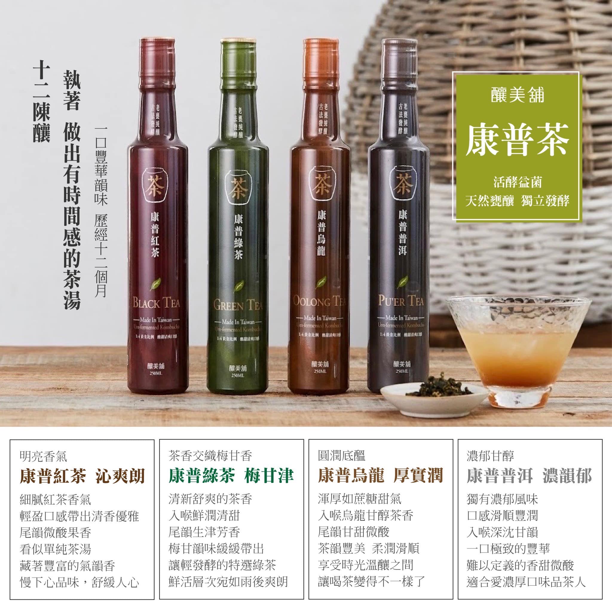 釀美舖堅持傳統古法 , 以台灣的茶葉天然發酵,歷經10-12個月的發酵程序,只取第一代發酵液體為原料,保留最完整的營養和酵素,活酵益菌增加循環代謝,既健康又享受。稀釋後的康普茶醋入喉甘醇茶香,尾韻帶出甘甜酸,冷熱飲皆宜,溫潤又爽口。
