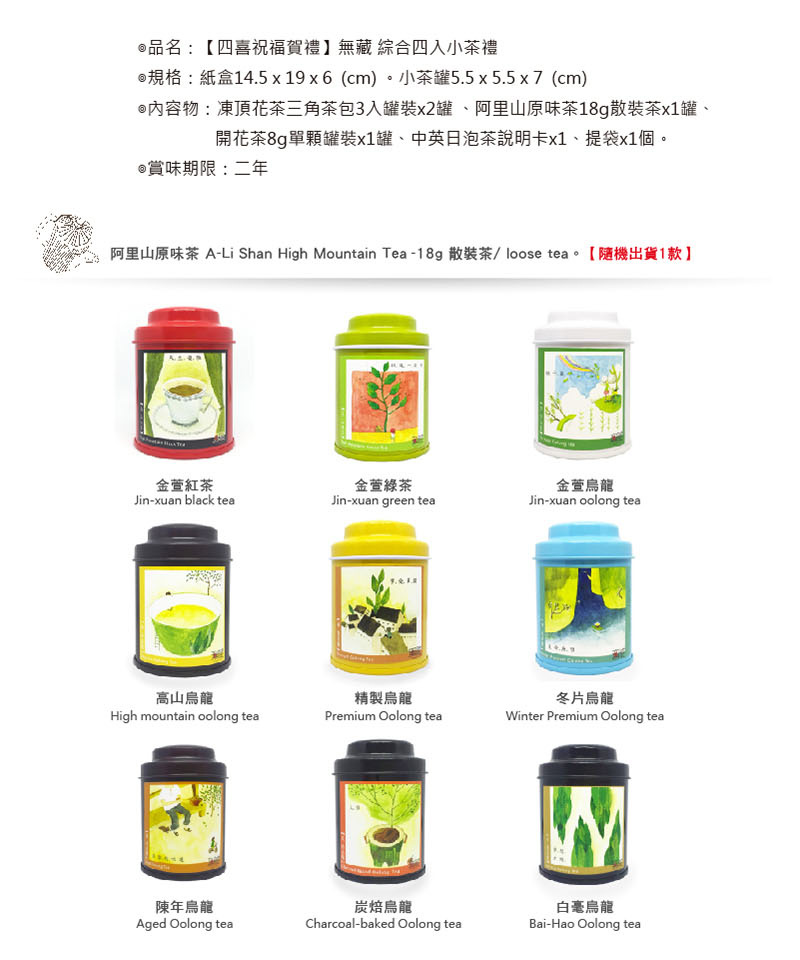 《 產品內容物與規格說明 》》》產品名稱:【四喜祝福賀禮】無藏 綜合四入小茶禮》》規格:(禮盒) 19.5 x 5.5 x 14.5 cm / (小茶罐) 5.5 x 5.5 x 7 cm / (提袋) 17 x 23 x 8 cm》》品牌:無藏茗茶》》商品種類:茶葉》》保存方式:乾燥 少日照處》》內容物:阿里山原味茶18g*1罐、凍頂花茶三角茶包3gx3入*2罐、開花茶8g單入*1罐、附中英日泡茶卡、提袋》》食品添加:無》》產地:台灣阿里山石棹茶區 / 台灣南投凍頂茶區 / 中國福建