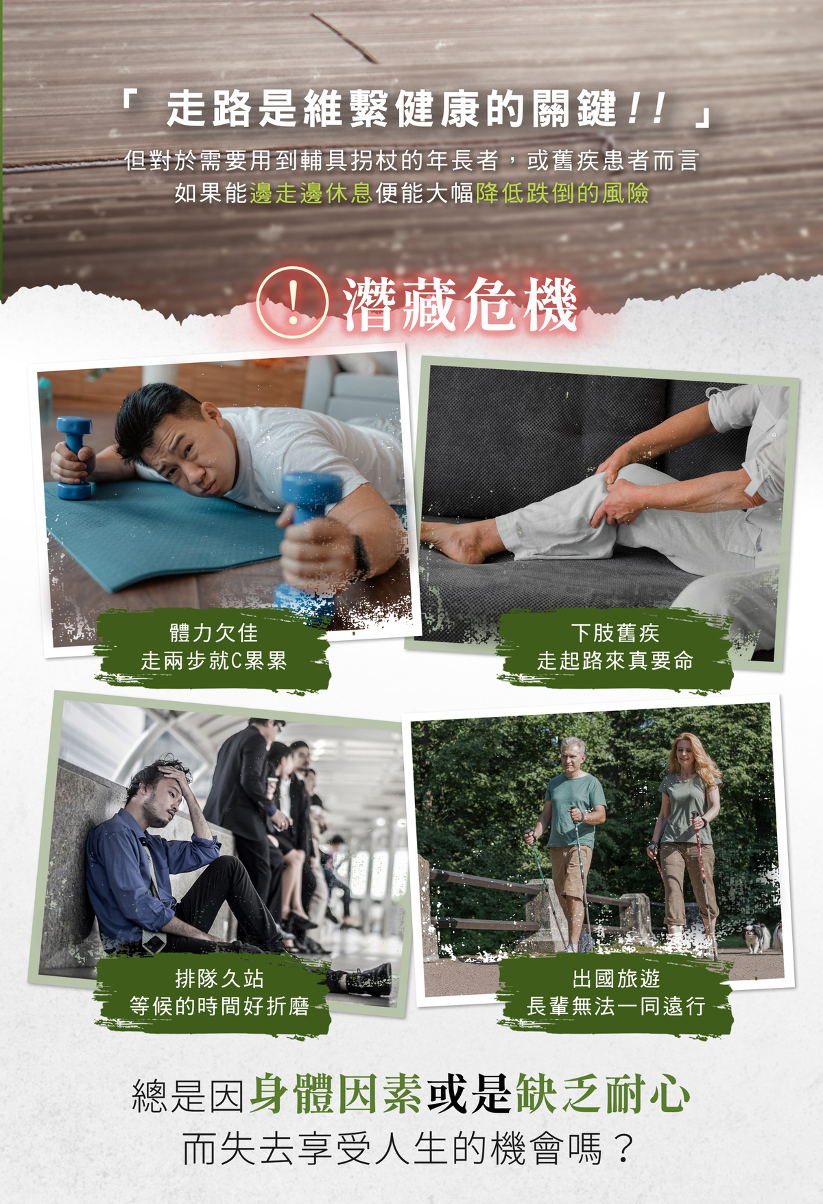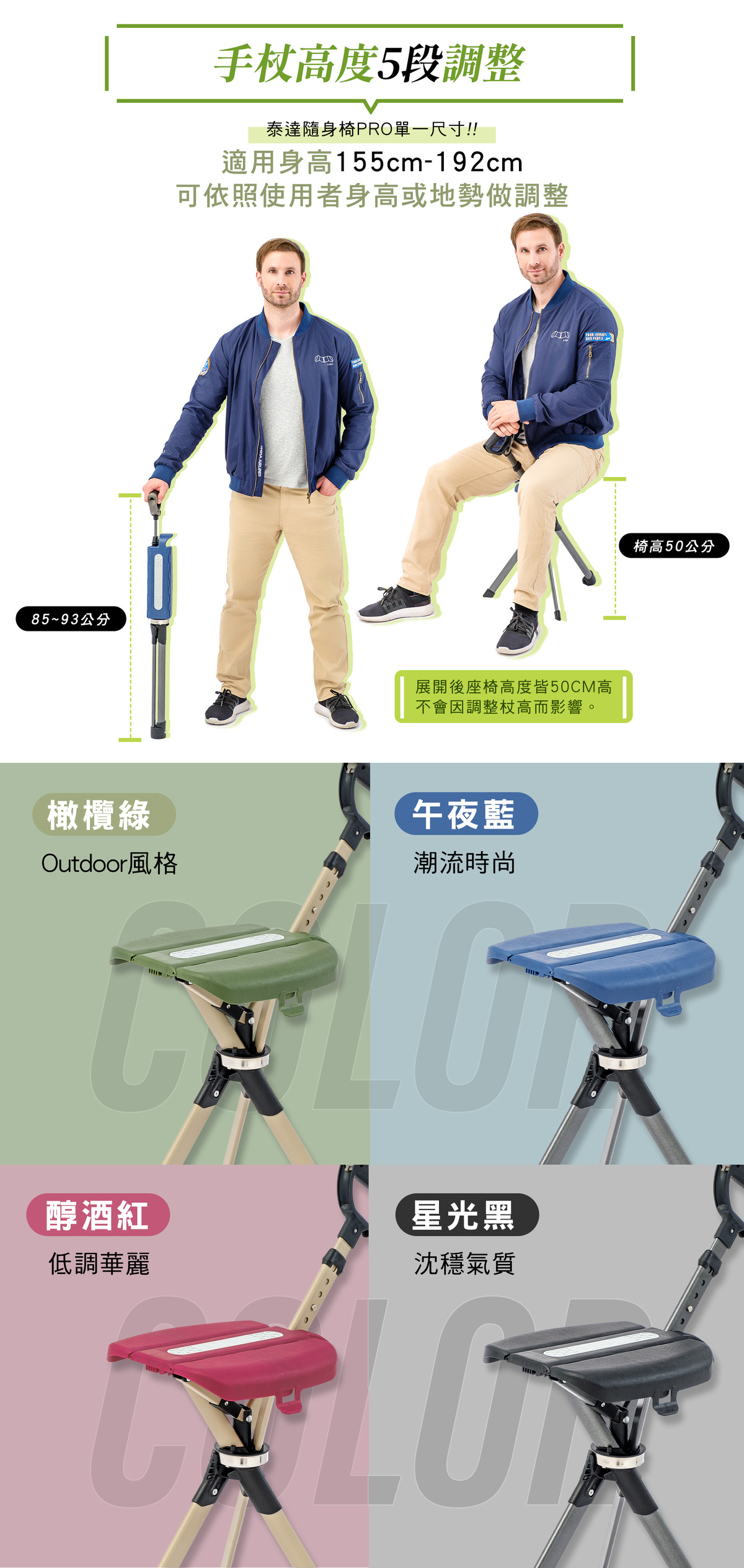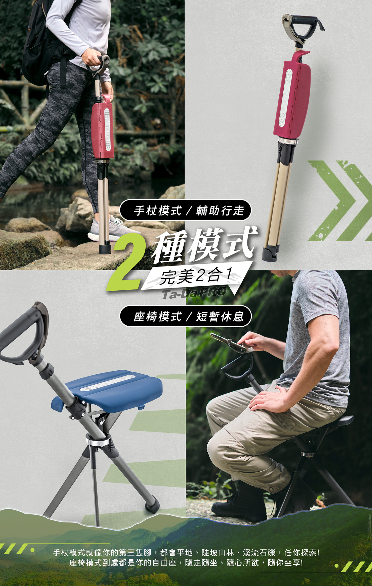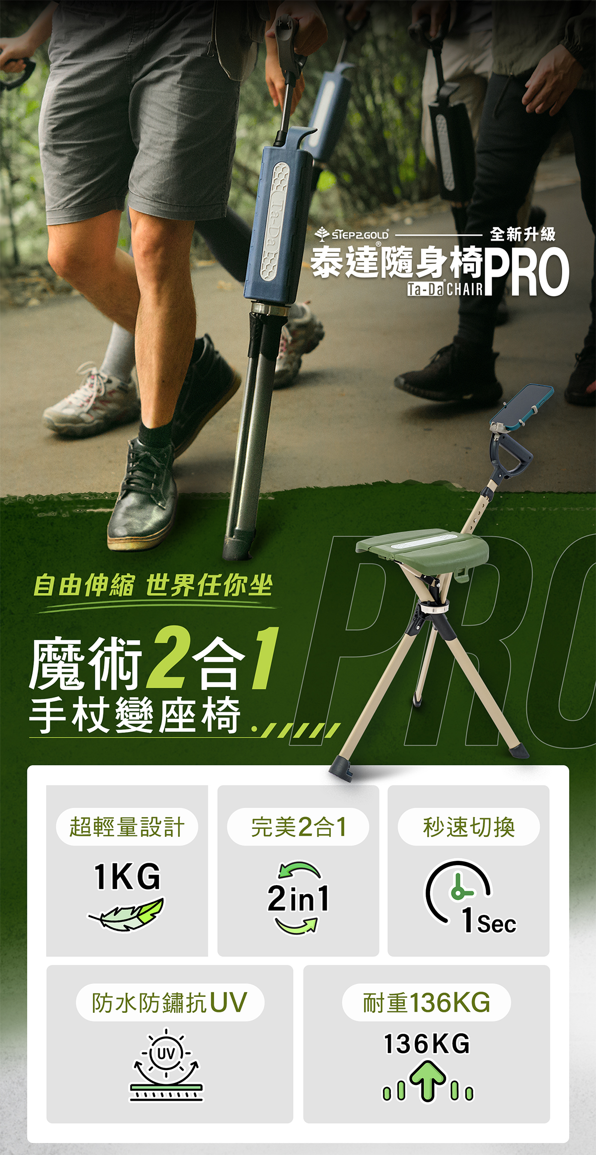 ●全新升級PRO,台灣50天破480萬募資●手杖座椅2合1,秒速開合輕鬆切換●自由伸縮,5段式杖高調節設計●羽量輕手感,136公斤超強載重●極度耐用耐操,航太等級防水防鏽抗UV●舒適貼合乘坐感,3片式超大椅面設計●質感升級,新配色與磨砂烤漆工藝●解放雙手,獨家手機座配件●獲選2023年經濟部評選最佳輔具優勝●適用多種活動用途:出國旅遊、戶外拐杖椅、可折疊座杖、登山助力杖、可坐式健走杖※適用對象 16歲以上能獨立行走🗹體重136KG以內※特別提醒▲產品1年保固▲本產品非醫療商品▲可帶上飛機▲本商品不提供背袋 需額外加購