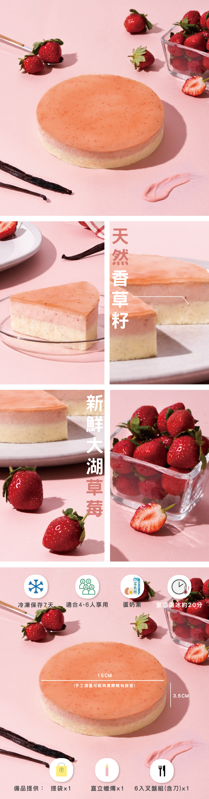 新鮮大湖草莓經慢火熬煮,全然釋放完熟多汁酸甜,藏於乳酪下擁有濃郁香氣的大溪地天然香草小黑點完美融合,多層次果香與誘人口感,如草莓香草雪糕般令人著迷!