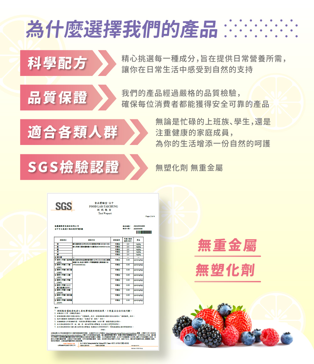 成分:造粒賦型劑(微結晶狀α-纖維素、麥芽糊精)、維生素C、檸檬香料粉(香料、玉米葡萄糖漿、阿拉伯膠)、硬脂酸鎂、二氧化矽、維生素E粉[乙酸dl-α-生育醇酯(維生素E)、乾燥葡萄糖漿、辛烯基丁二酸鈉澱粉、二氧化矽]、余甘子抽出物(余甘子抽出物、麥芽糊精、食鹽、二氧化矽)、硒酵母、綜合莓果萃取物(麥芽糊精、黑莓果粉、黑醋栗果粉、藍莓果粉、草莓果粉、覆盆莓果粉、蔓越莓果粉、巴西莓果粉)、蔗糖素(甜味劑)食品添加物:維生素C、硬脂酸鎂、二氧化矽、乙酸dl-α-生育醇酯(維生素E)、辛烯基丁二酸鈉澱粉、蔗糖素