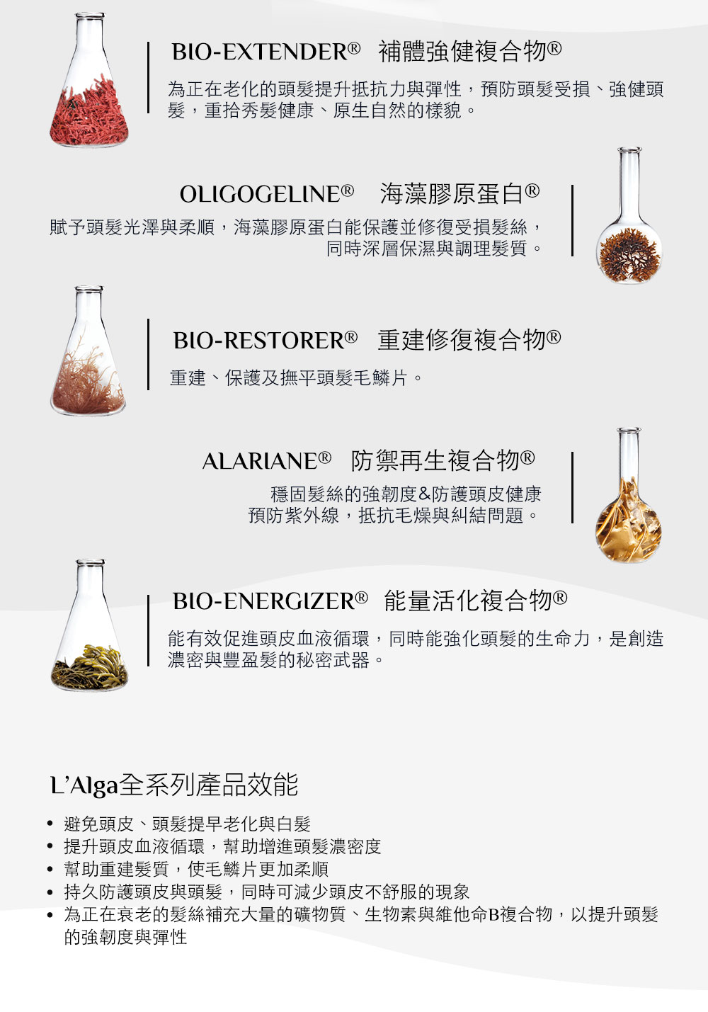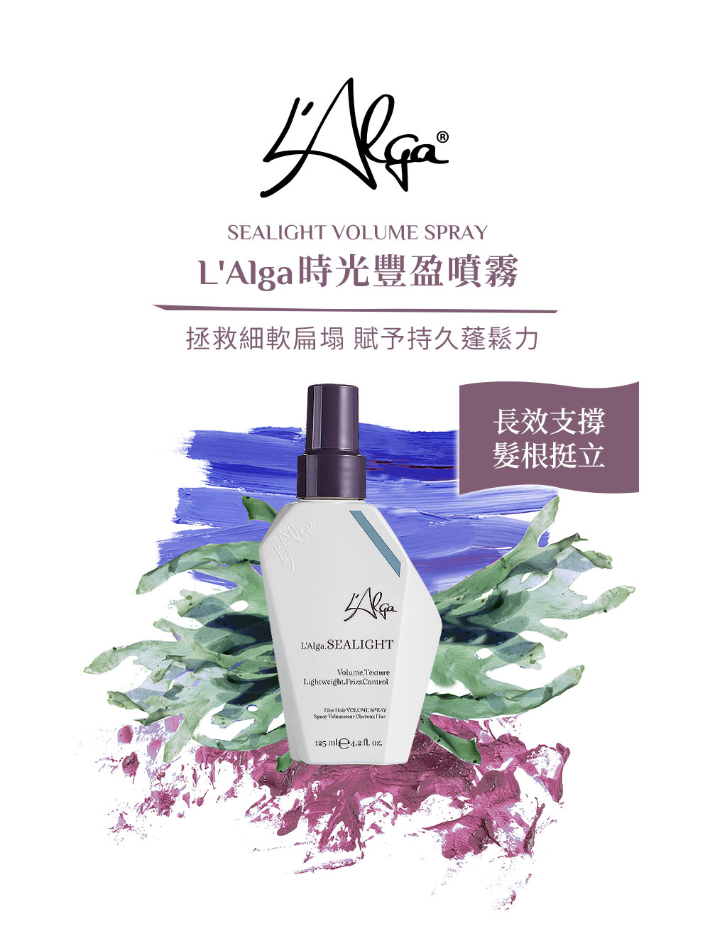 L’Alga 來自深海的髮肌能源之鑰 為頭髮注入生命泉源特種海藻專利配方 AlgaNord5™,採用最尖端科技生物萃取技術,有效賦活頭皮、強韌髮絲,形成防護層抵禦外在傷害,頭髮永保青春彈力