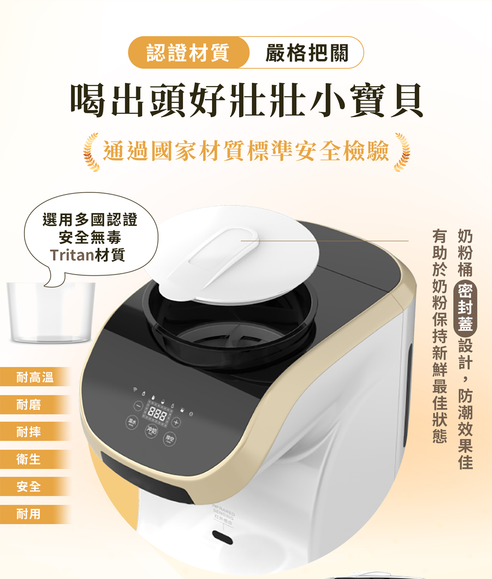 ◎ 智能自動泡奶機商品尺寸:220*340*380mm商品材質:Tritan(混和倉、奶粉桶)、GPPS(水箱)產品容量:水箱1.4L、奶粉桶300g商品重量:6kg商品產地:中國供電方式:插頭功 率:1350w輸入電壓:110VAC