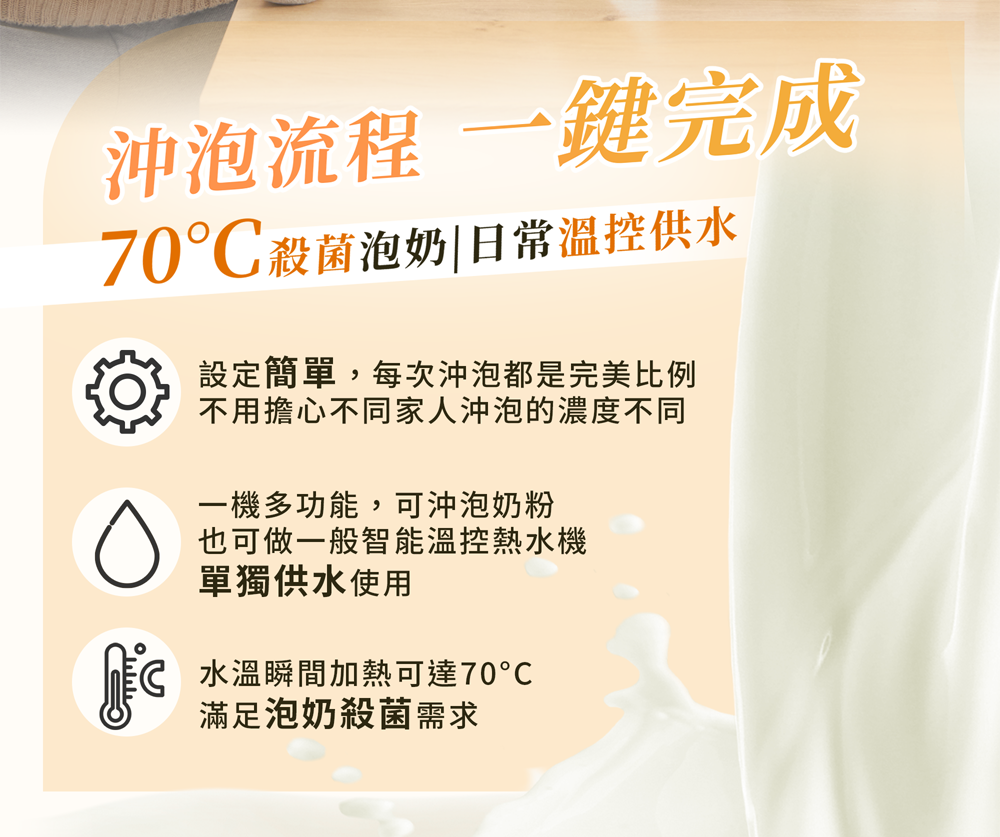 ➊ 沖泡水量:30~240ml (每10mi調整)➋ 溫度範圍:37°C-55°C(一度一調)、60°C、70°C➌ 貼心提醒:水溫未達100度煮沸功能,請務必添加飲用水