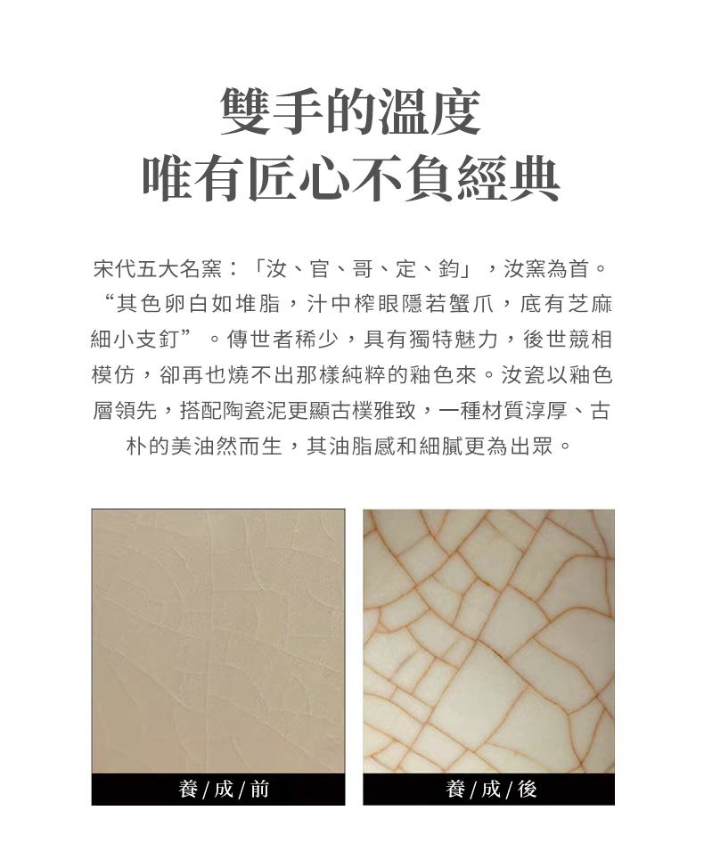 經高溫燒製而成的天青釉 / 米黃釉,自然呈現細膩油潤光澤與冰裂開片紋理,越用越美。