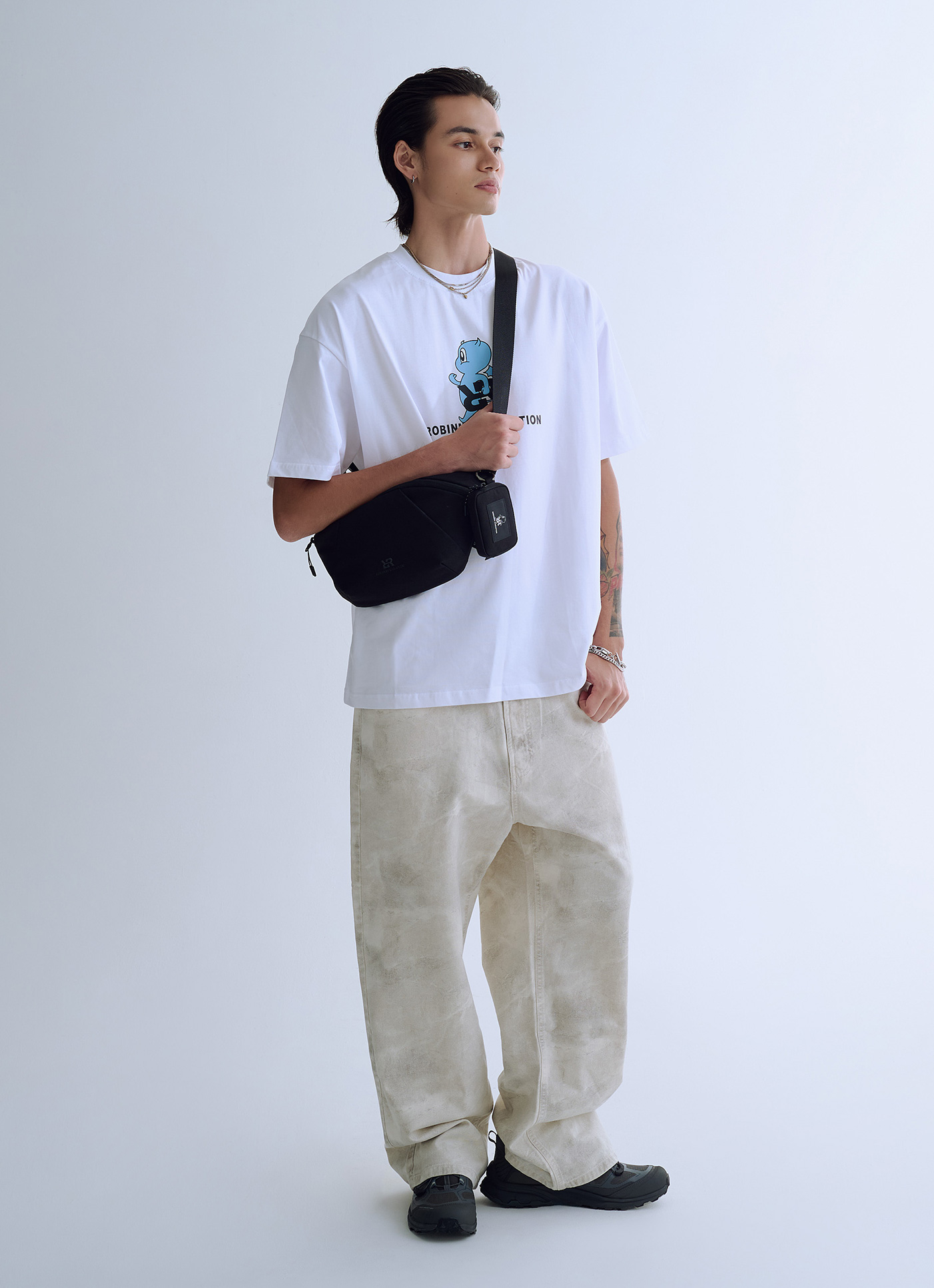 休閒可頌造型胸包,前側皺摺設計添加層次感可放置長夾、6.7吋手機✔️基本收納空間,可置入外出物品男士支線品牌字母標誌點綴,低調不失質感背帶一體成型,滑動調整長短,自由變換背法附品牌 IP 小惡魔 Pranky 零錢包掛飾 (11*2*8cm)