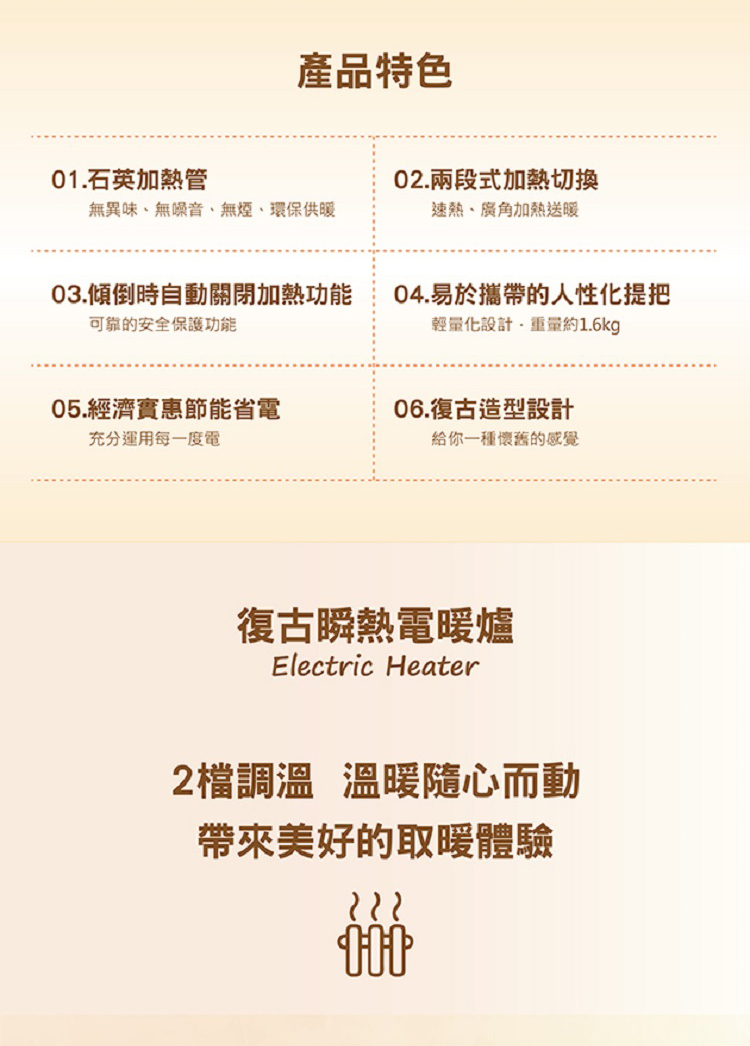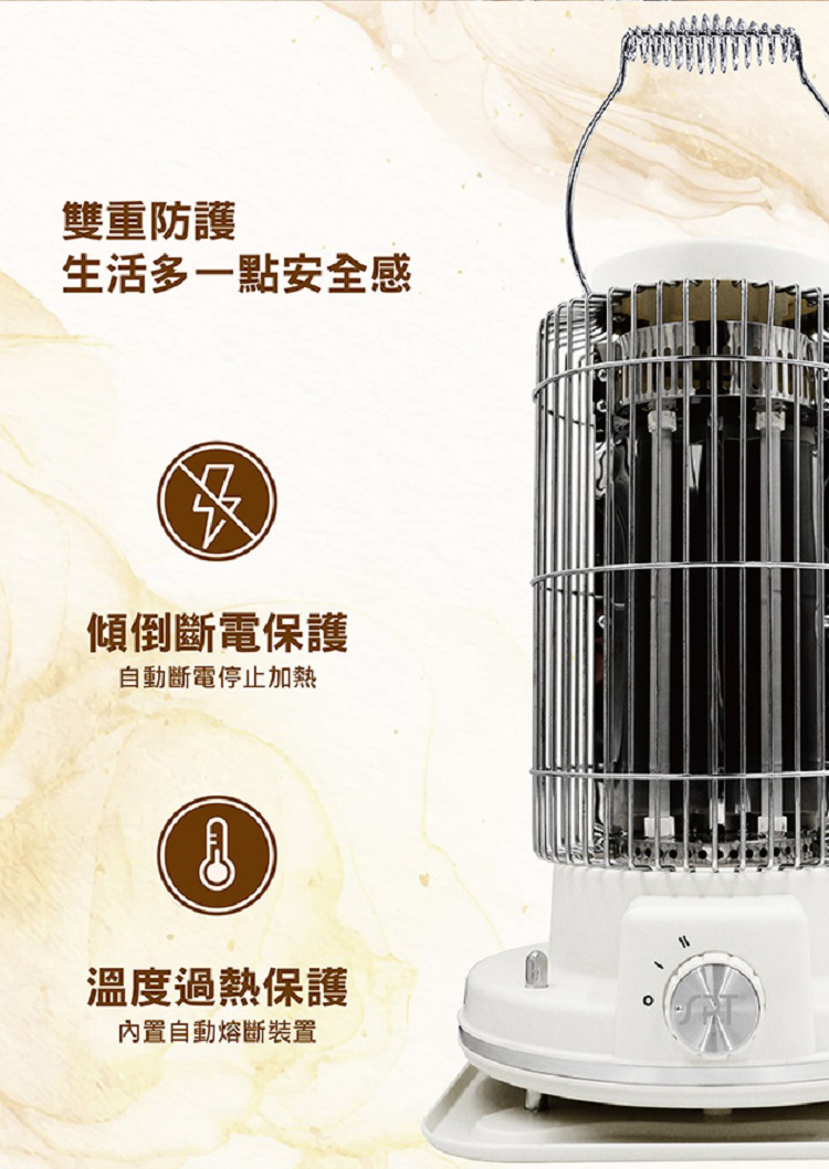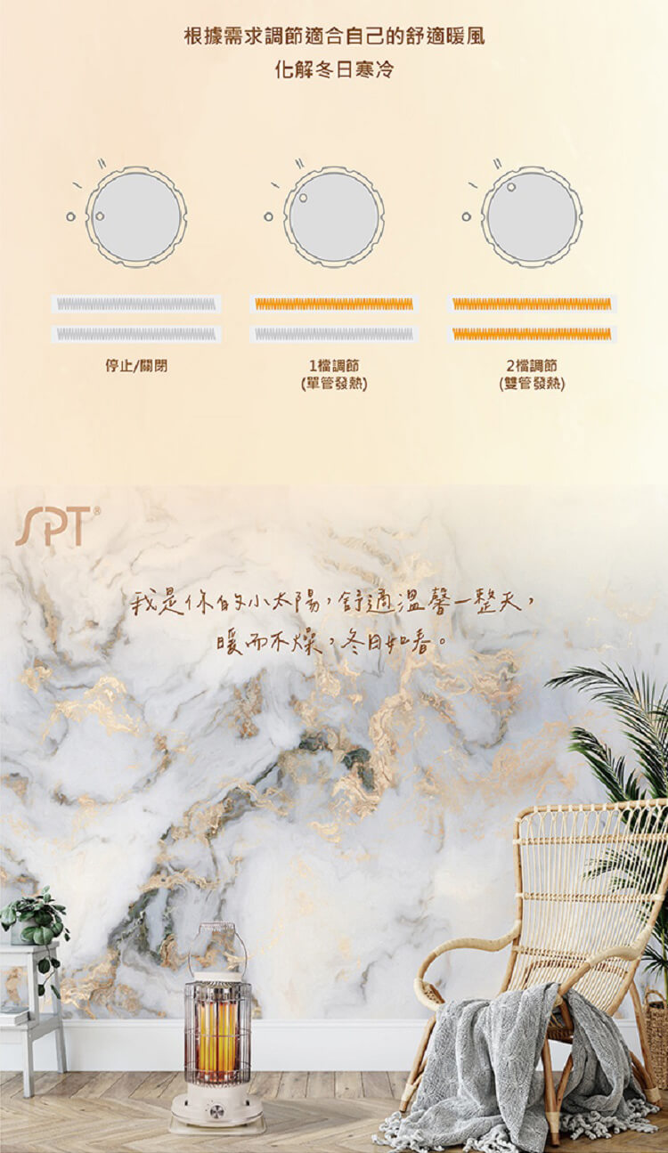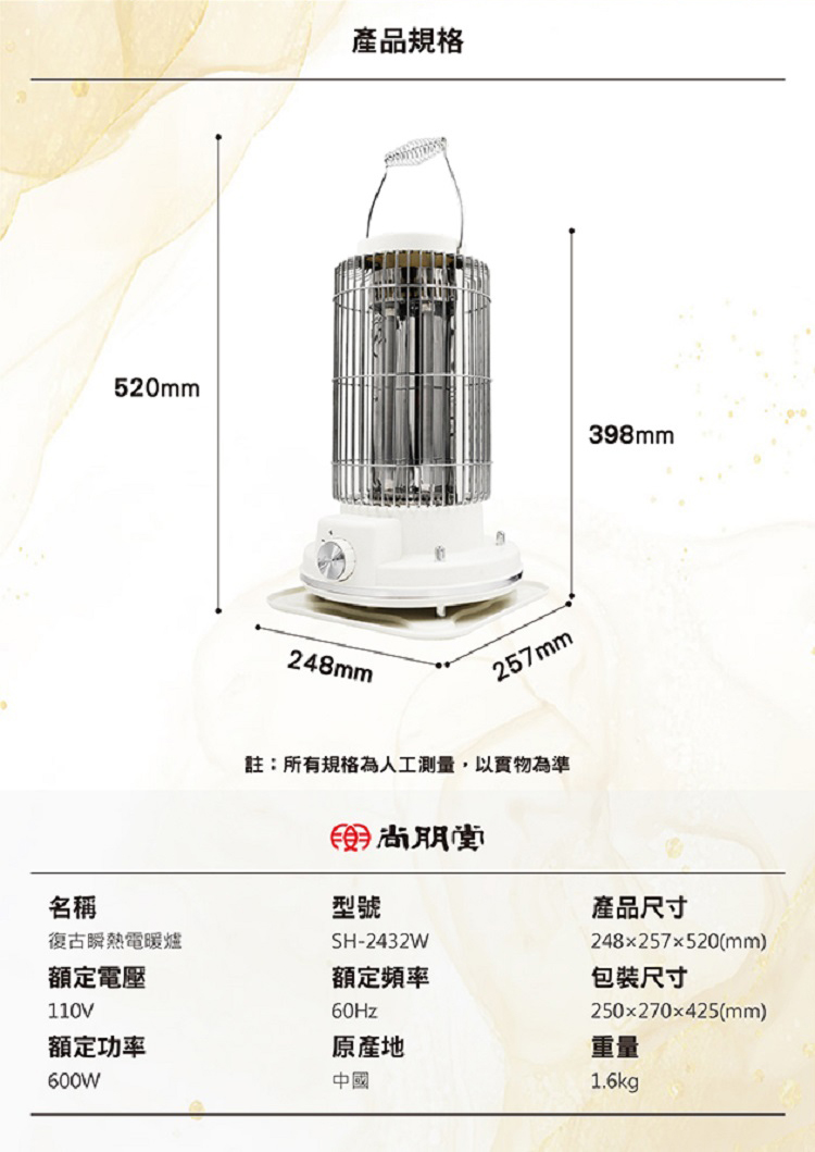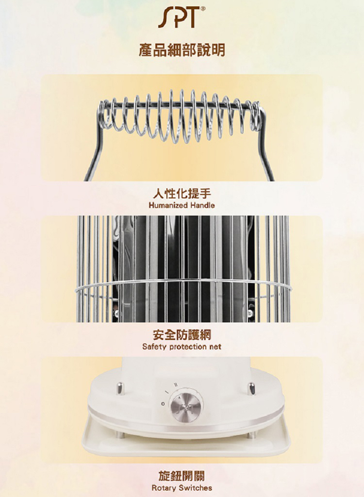 商品特色雙重防護天然石英管發熱3秒速熱220度大廣角取暖輕量化設計商品規格產品品牌:SPT 尚朋堂產品品名:即熱式電暖器 產品型號:SH-2432W產品產地:中國產品尺寸:24.8cm (W) * 25.7cm (D) * 39.8cm (H)外箱尺寸:27.0cm (W) * 25.0cm (D) * 42.5cm (H)產品重量:1.6 KG/台保固:有電壓(V/Hz):110V/60HZ可設溫度:否最大/最小消耗功率:600wBSMI許可字號 R56297