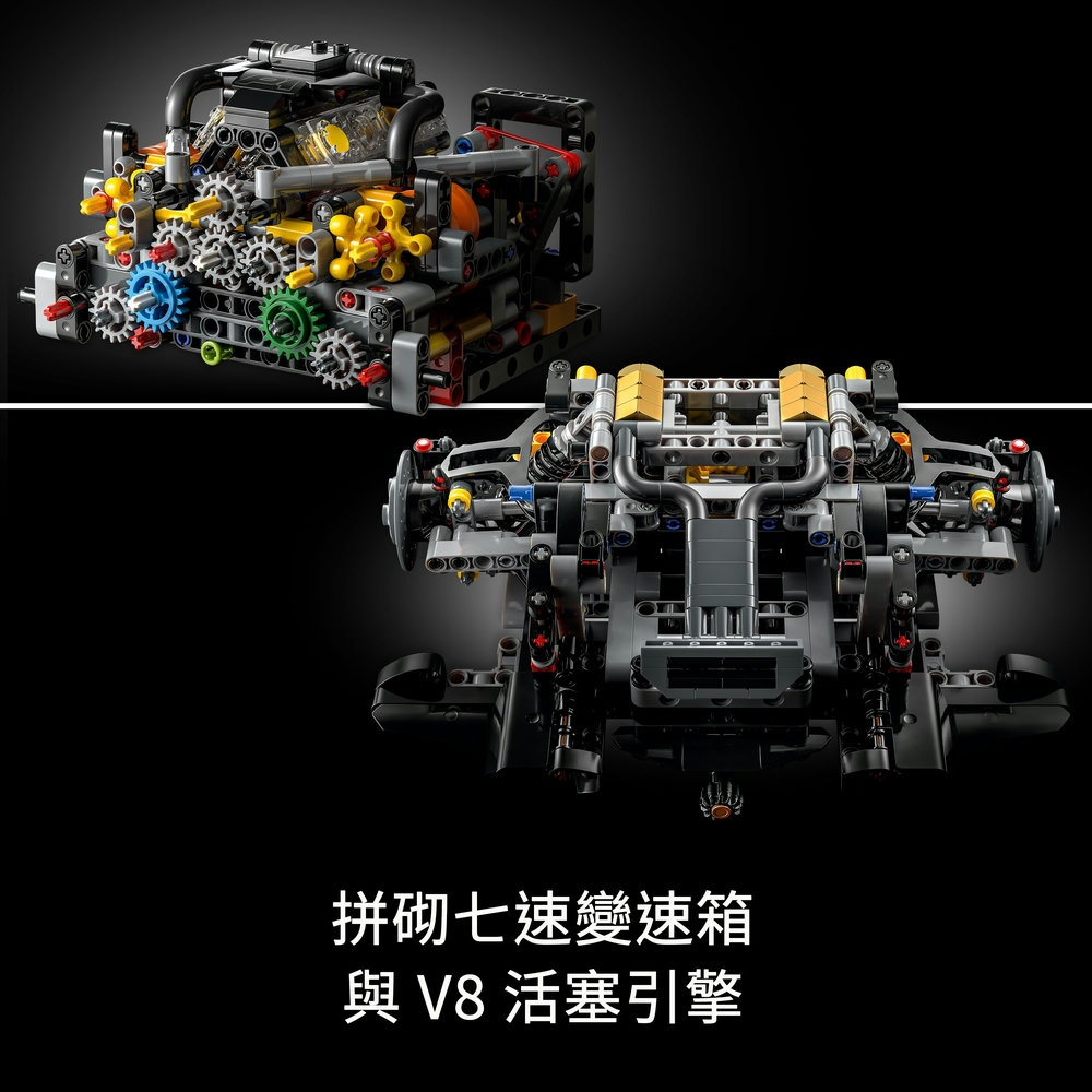• 拼砌 V8 活塞引擎等等-組裝有變速鼓的七速變速箱、可打開的車門、可調式尾翼與 V8 活塞引擎等所有細節,享受正念活動