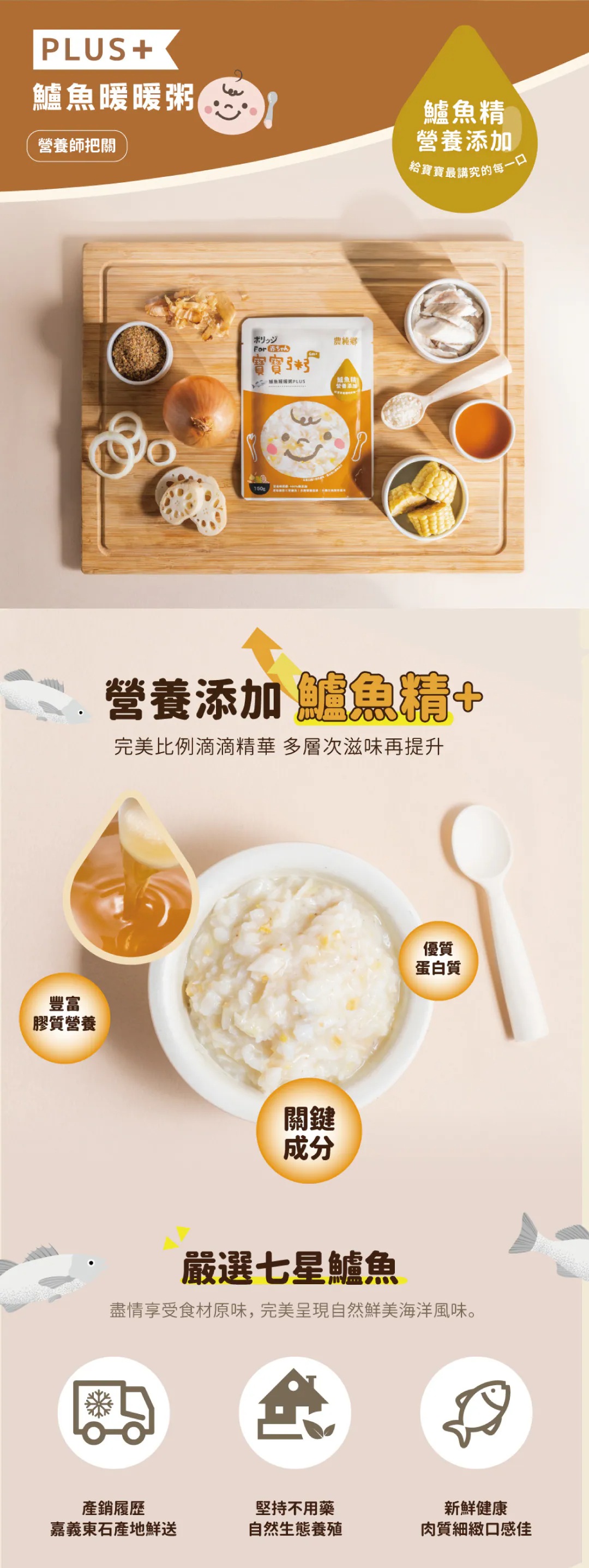 6個月以上適用全台唯一『雙』100% 無添加潔淨標章的寶寶粥營養PLUS+ 滴雞精、鱸魚精,營養師把關 鈉含量OK新鮮製作,可常溫保存12個月快速加熱,隨時享用(新舊包裝轉換中,以實際收到商品為主)