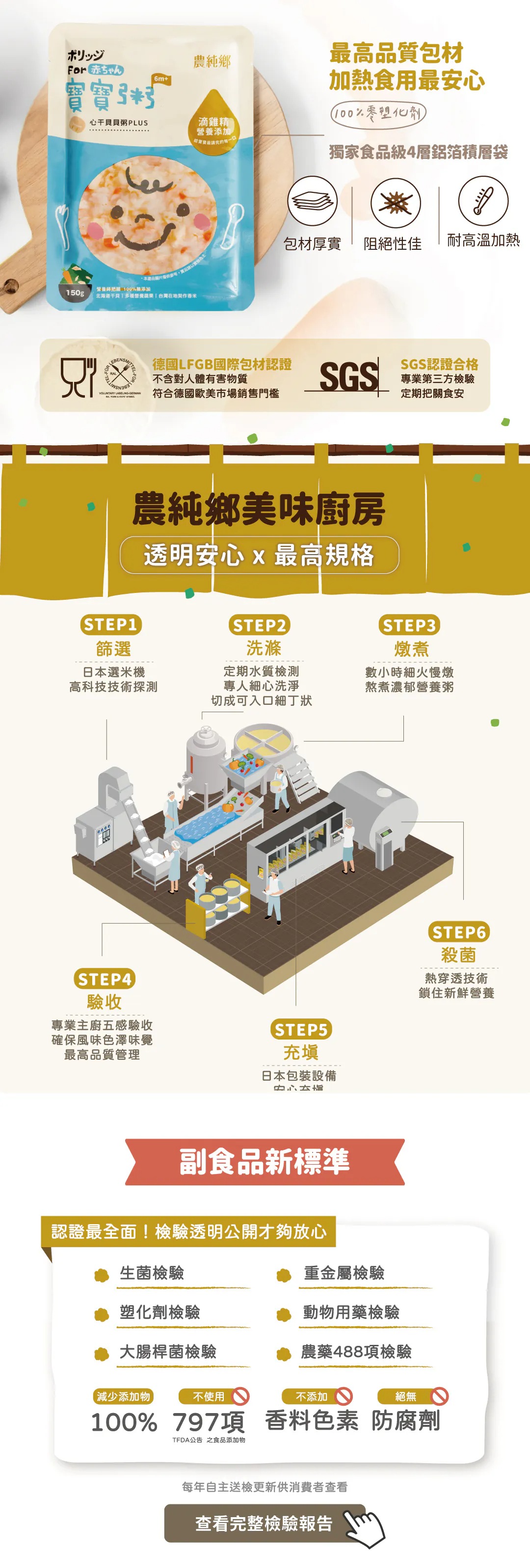 1.商品組合/規格:【農純鄉】寶寶粥體驗組 16入(雞肉+豬肉+干貝+鱸魚)2.商品品名:【農純鄉】寶寶粥體驗組 16入(雞肉+豬肉+干貝+鱸魚)3.內容成分◆日日雞肉粥 PLUS:水、雞肉、台灣香米、洋蔥、滴雞精、紅蘿蔔、玉米、香菇。※本產品與其它含有蝦、蟹、花生、牛奶、蛋、魚類、堅果類、芝麻、含麩質之穀物、大豆、亞硫酸鹽類的產品於同一生產線生產,食物過敏者請留意。※因使用新鮮玉米,經切碎烹煮後仍會有半透明薄膜,玉米膜為可食用的天然纖維質,敬請安心。◆心干貝貝粥 PLUS:水、台灣香米、紅蘿蔔、滴雞精、柴魚粉、干貝、海苔粉。※本產品含有魚類、螺貝類過敏原,並與其它含有蝦、蟹、花生、牛奶、蛋、堅果類、芝麻、含麩質之穀物、大豆、亞硫酸鹽類的產品於同一生產線生產,食物過敏者請留意。※柴魚粉為天然柴魚研磨成細粉使用。◆乖乖豬豬粥 PLUS:水、海藻豬肉 (台灣)、台灣香米、玉米、滴雞精、紅蘿蔔、青花菜。※本產品與其它含有蝦、蟹、花生、牛奶、蛋、魚類、堅果類、芝麻、含麩質之穀物、大豆、亞硫酸鹽類的產品於同一生產線生產,食物過敏者請留意。※因使用新鮮玉米,經切碎烹煮後仍會有半透明薄膜,玉米膜為可食用的天然纖維質,敬請安心。◆鱸魚暖暖粥 PLUS:鱸魚精 (水、鱸魚)、台灣香米、鱸魚、洋蔥、玉米、蓮藕、柴魚粉。※本產品含有魚類(鱸魚、柴魚),並與其它含有蝦、蟹、花生、牛奶、堅果類、蛋、豆、麥的產品於同一生產線生產,食物過敏者請留意。※因使用完整鱸魚片,寶寶粥中的黑色顆粒為鱸魚魚皮,富含膠質請安心食用。鱸魚片已經過兩道挑刺程序,食用時仍請多加注意魚刺。※因使用新鮮玉米,經切碎烹煮後仍會有半透明薄膜,玉米膜為可食用的天然纖維質,敬請安心。4.商品重(容)量:150公克 x 16包/盒5.原產地(國):台灣6.保存期限:常溫 12個月(請放置於陰涼處,避免陽光直射)(實際依商品包裝標示)7.製造廠商或國內負責廠商名稱:吉康食品股份有限公司8.製造廠商或國內負責廠商地址:407台中市西屯區工業31路13號9.製造廠商或國內負責廠商電話:0800-43528810.食品業者登錄字號:B123107476-00001-011.投保產品責任險字號:兆豐產物-0218第13PDL00145號