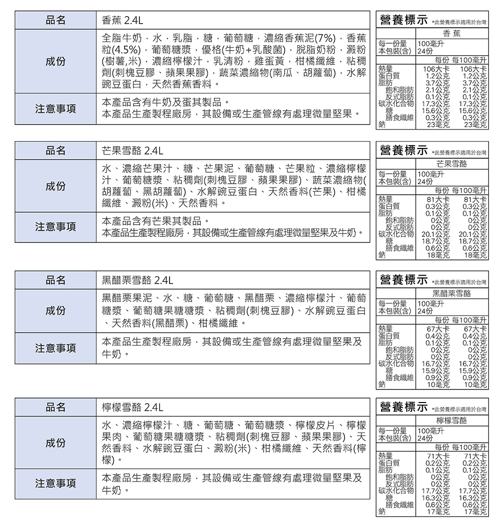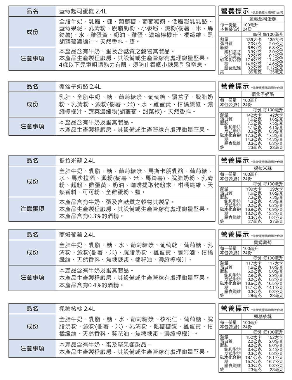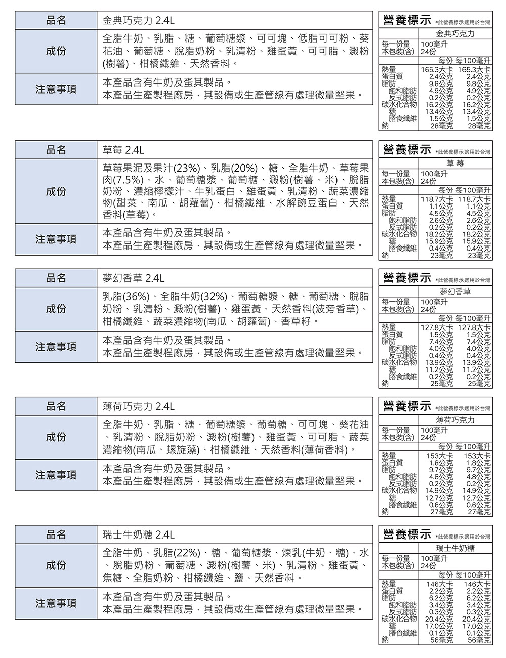 商品口味:夢幻香草、金典巧克力、草莓、薄荷巧克力、蘭姆葡萄、提拉米蘇、義大利起司、瑞士牛奶糖、藍莓起司蛋糕、覆盆子奶酪、芒果牛奶、鹽味焦糖巧克力、卡布奇諾、咖啡、楓糖核桃、香蕉、黑醋栗雪酪、檸檬雪酪、芒果雪酪