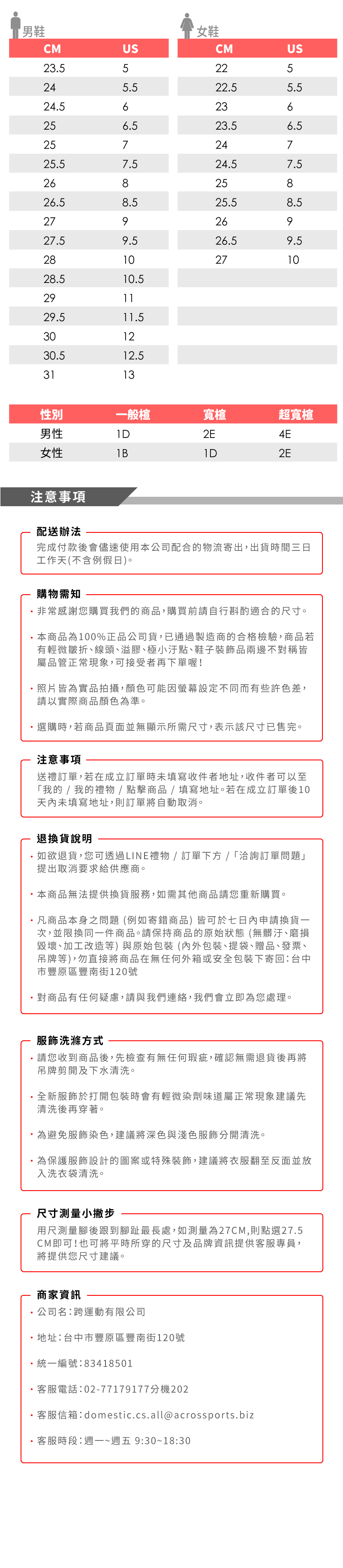* 重量: 301g(男鞋9號)269g(女鞋8.5號)。