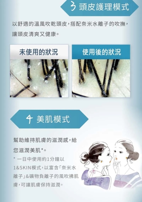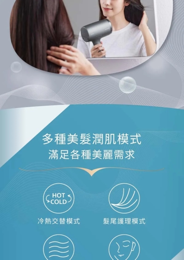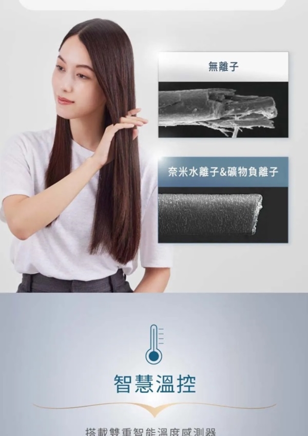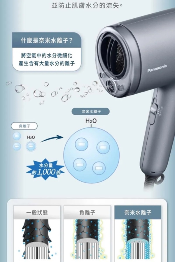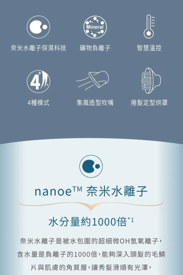 用柔潤智慧呵護秀髮,超越負離子1000倍保濕 多重護髮潤肌模式- 從頭皮到髮梢和肌膚的各種護理模式, 滿足各種需求搭載奈米水離子&礦物負離子 - 浸透髮絲,秀髮水亮光澤;強化秀髮保護力,揮別毛躁與乾澀智慧溫控 - 搭載雙重智能溫度感測器,舒適吹髮,減少熱傷害4大美髮潤肌模式 - 冷熱交替模式、髮尾護理模式、頭皮模式、美肌模式nanoe 奈米水離子 - 超越負離子1000倍的保濕力浸透髮絲,使髮質健康強韌有光澤。礦物負離子 - 在頭髮上形成保護膜,降低紫外線與摩擦對秀髮的傷害。速乾吹嘴(內建) - 形成強弱風差, 快速吹乾髮絲