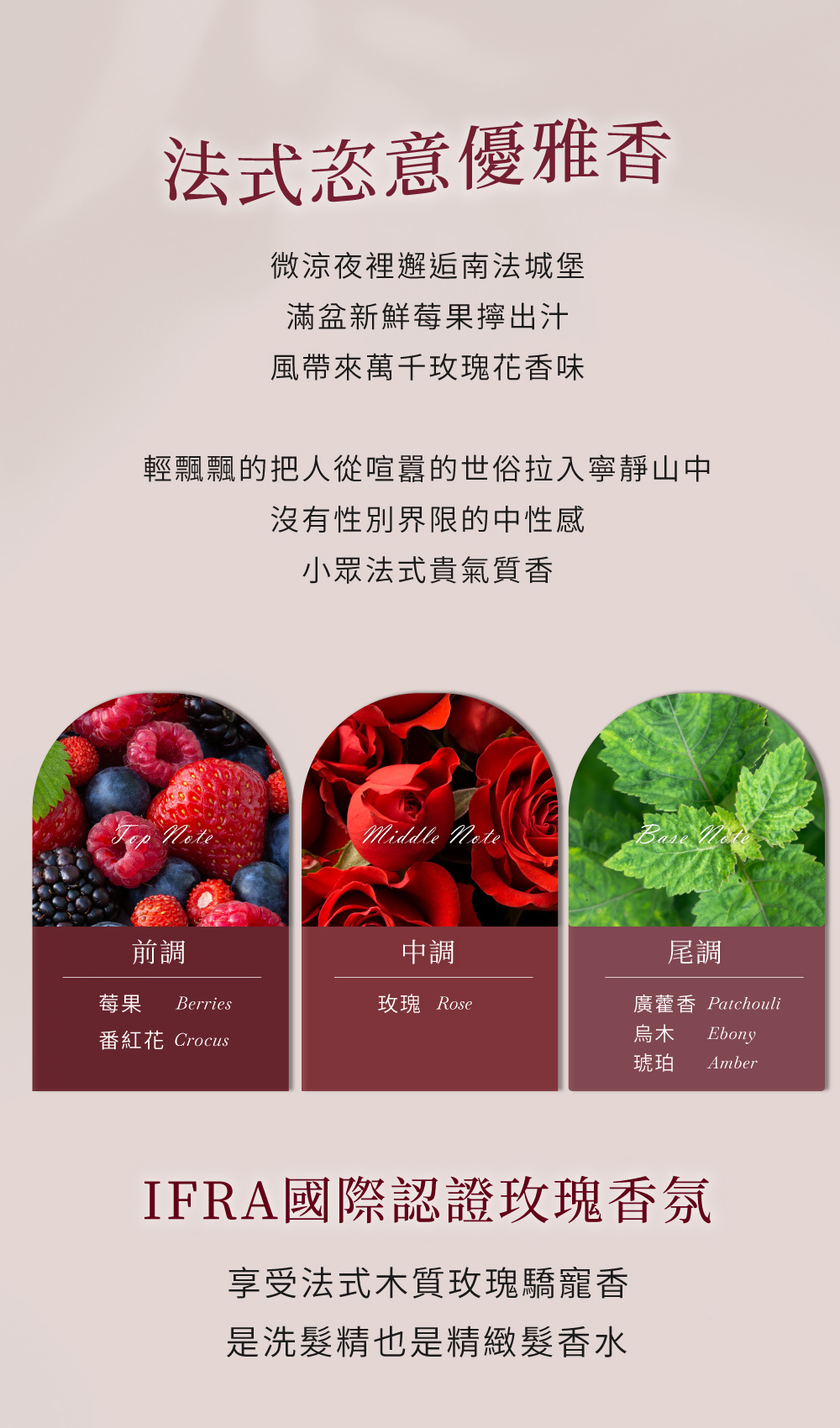 木質玫瑰香│倘佯在法式花香中,成熟而優雅以玫瑰點綴妳的耀眼光芒前調:莓果、番紅花中調:玫瑰後調:廣藿香、烏木、琥珀