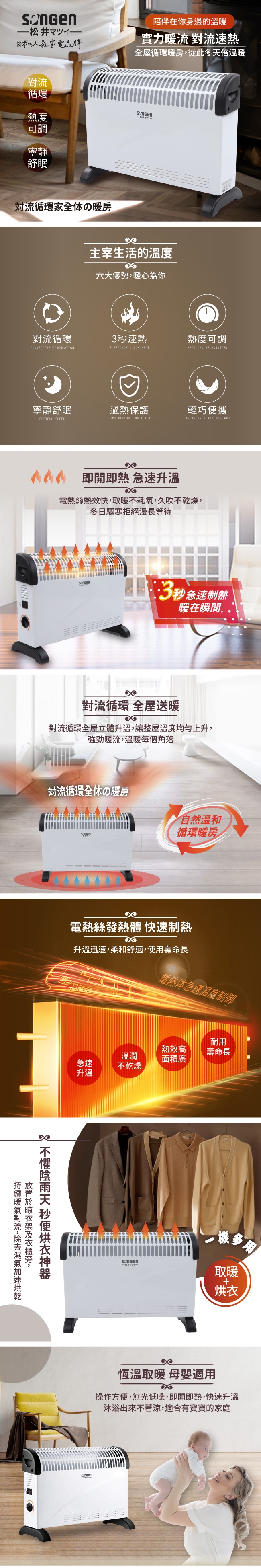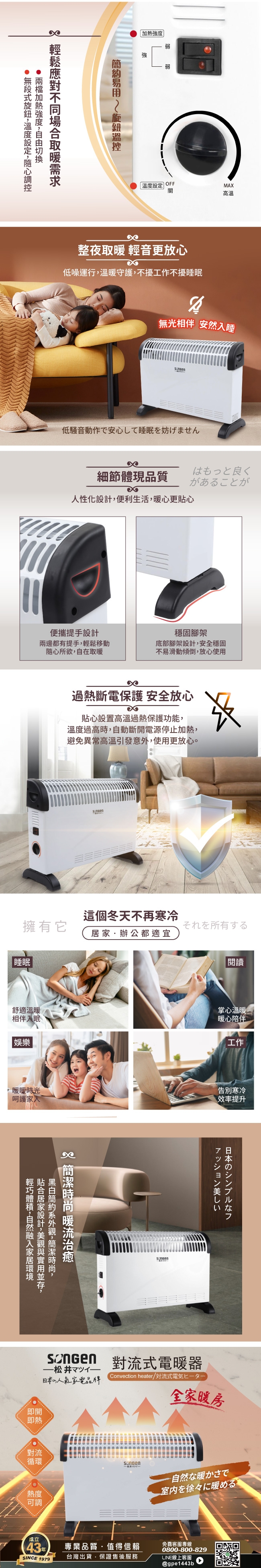商品特色對流式循環送暖,全屋暖房 急速熱轉換,即開即熱,快速驅寒 無光害、無噪音、無耗氧、無輻射 強弱兩檔加熱強度,方便易操作 無段式旋鈕自由調節,恆溫控制 過熱斷電保護,使用更安心商品規格商品品牌:SONGEN松井 商品型號:SG-161RCT 商品名稱:對流式溫控電暖器使用電源:110V / 60Hz額定功率:1400W產品尺寸:寬520x深107x高335mm商品重量:2.9KG產品保證:明台產物保險2000萬產品責任險商檢字號:R73998商品保固:一年保固