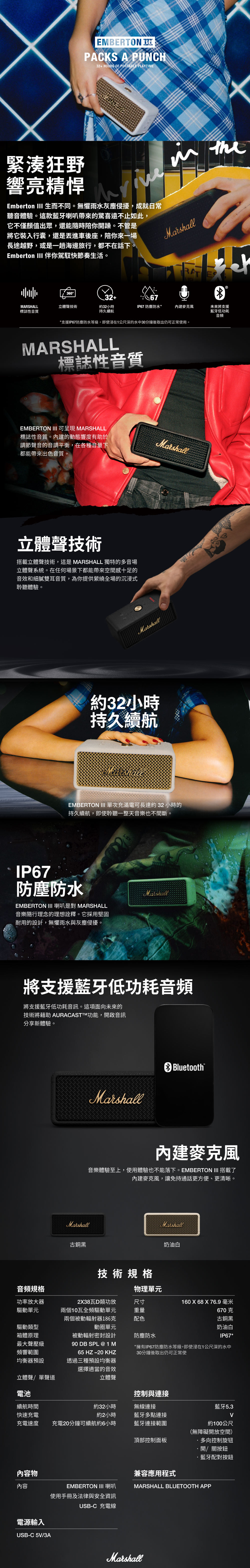 在盡情享受生活的同時,你也能享受 Emberton III 帶來的 360 度環繞音效。 Marshall 獨特的立體聲技術帶來多方位立體聲體驗,讓你所在之處皆如音樂現場。不論你身在何處,都能感受到動感、均衡和響亮的音效。喇叭支援約32小時持久續航及電池保護功能,有效延長電池壽命,讓你的音樂聆聽不打烊。