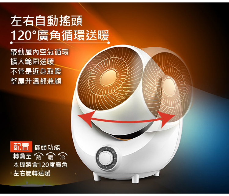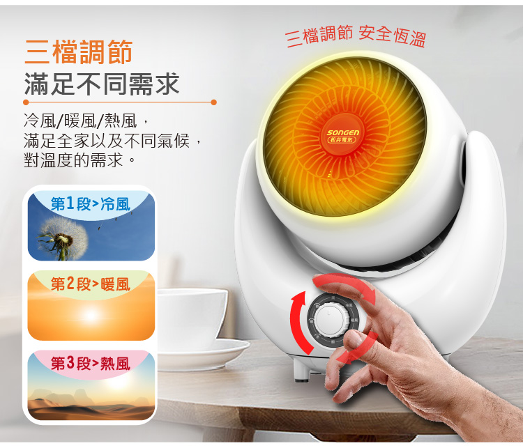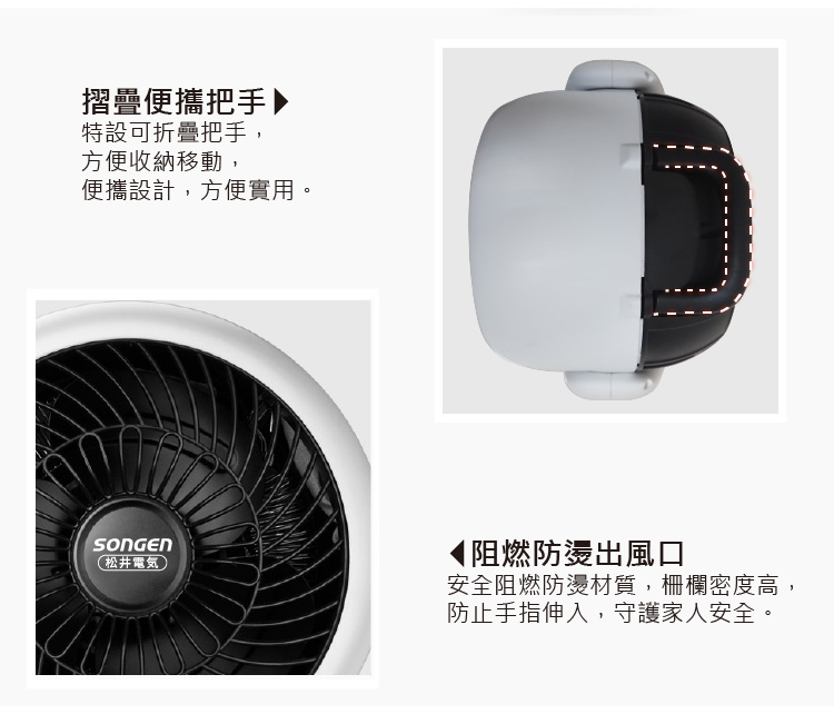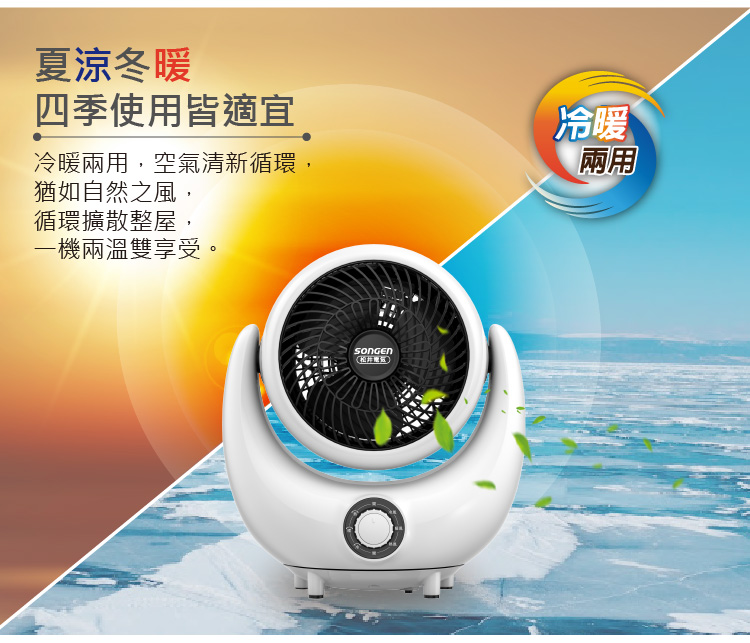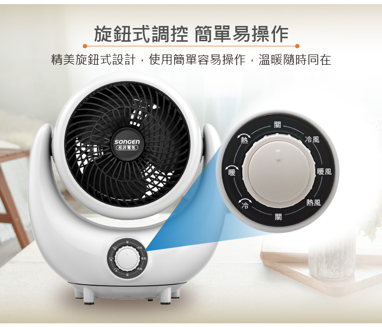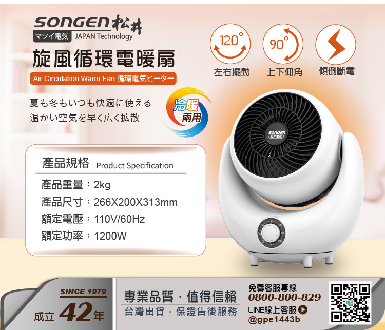 商品特色暖氣機+涼風扇,冬夏皆宜 無光害、無噪音、無耗氧、無輻射 三段式調節溫控,方便易操作 120度自動左右廣角循環送暖 90度仰角調節,大範圍取暖 傾倒斷電裝置,安全更安心商品規格商品品牌:SONGEN松井 商品型號:SG-201ACW商品名稱:3D旋風循環冷暖兩用電暖扇使用電源:110V / 60Hz額定功率:1200W產品尺寸:寬266x深200x高313mm商品重量:2KG產品保證:明台產物保險2000萬產品責任險商檢字號:R73998商品保固:一年保固