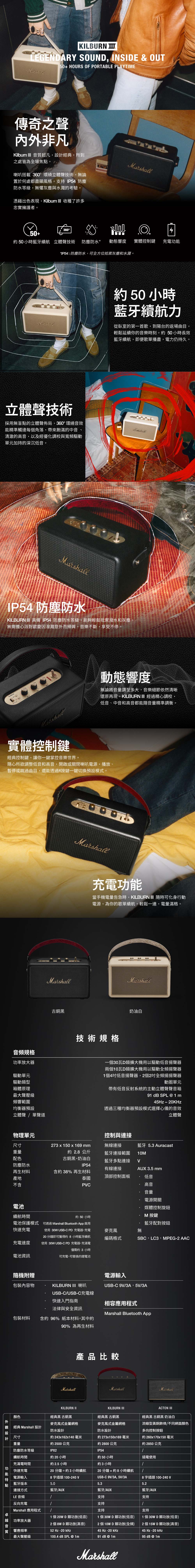 從臥室的第一首歌,到陽台的返場曲目,輕鬆延續你的音樂時刻。約 50 小時長效藍牙續航,即便歌單播盡,電力仍持久。採用無盲點的立體聲佈局,360° 環繞音效能精準觸達每個角落,帶來飽滿的中音、清澈的高音,以及經優化調校與寬頻驅動單元加持的深沉低音。:Kilburn III 具備 IP54 防塵防水等級,能夠輕鬆抵禦水潑水和灰塵。無需擔心派對歡慶因潑濺意外而掃興,音樂不斷,享受不停。:無論將音量調至多大,音樂細節依然清晰還原再現。Kilburn III 經過精心調校,低音、中音和高音都能隨音量精準調衡。經典控制鍵,讓你一鍵掌控音樂世界。隨心所欲調整低音和高音,開啟或關閉喇叭電源,播放、暫停或跳過曲目,還能透過M按鍵一鍵