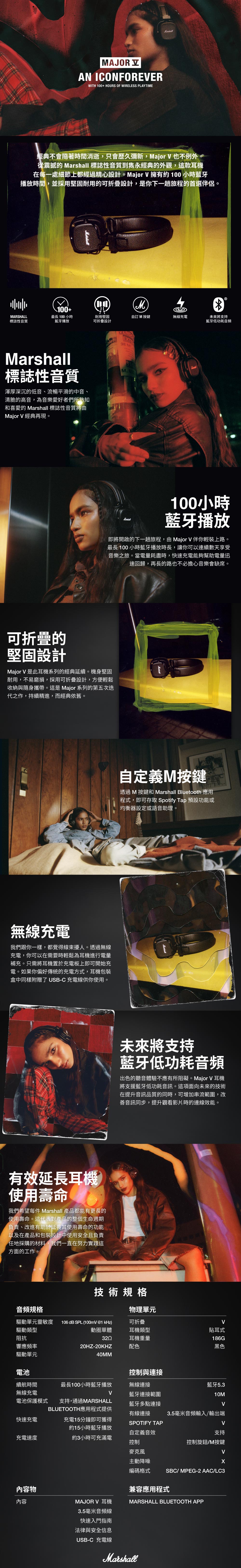 經典不會隨著時間消逝,只會歷久彌新,MAJOR V 也不例外。從震撼的MARSHALL 標誌性音質到雋永經典的外觀,這款耳機在每個細節上都經過精心設計。MAJOR V 擁有約100小時藍牙播放時間,並採用堅固耐用的可折疊設計,是你下一趟旅程的首選伴侶。MAJOR V 支援一系列全新功能,每個聆聽時刻都值得信賴。使用機身上的M按鍵可直接存取SPOTIFY TAP,或使用MARSHALL BLUETOOTH應用程序,重設為均衡器預設或喚起語音助手,一切掌控均在指尖。內建麥克風新升級,可更好地降低風噪以提升通話品質。現在,在旅途中接聽來電比以往都更加順暢。耳罩式無線藍牙耳機,約100小時續航力。