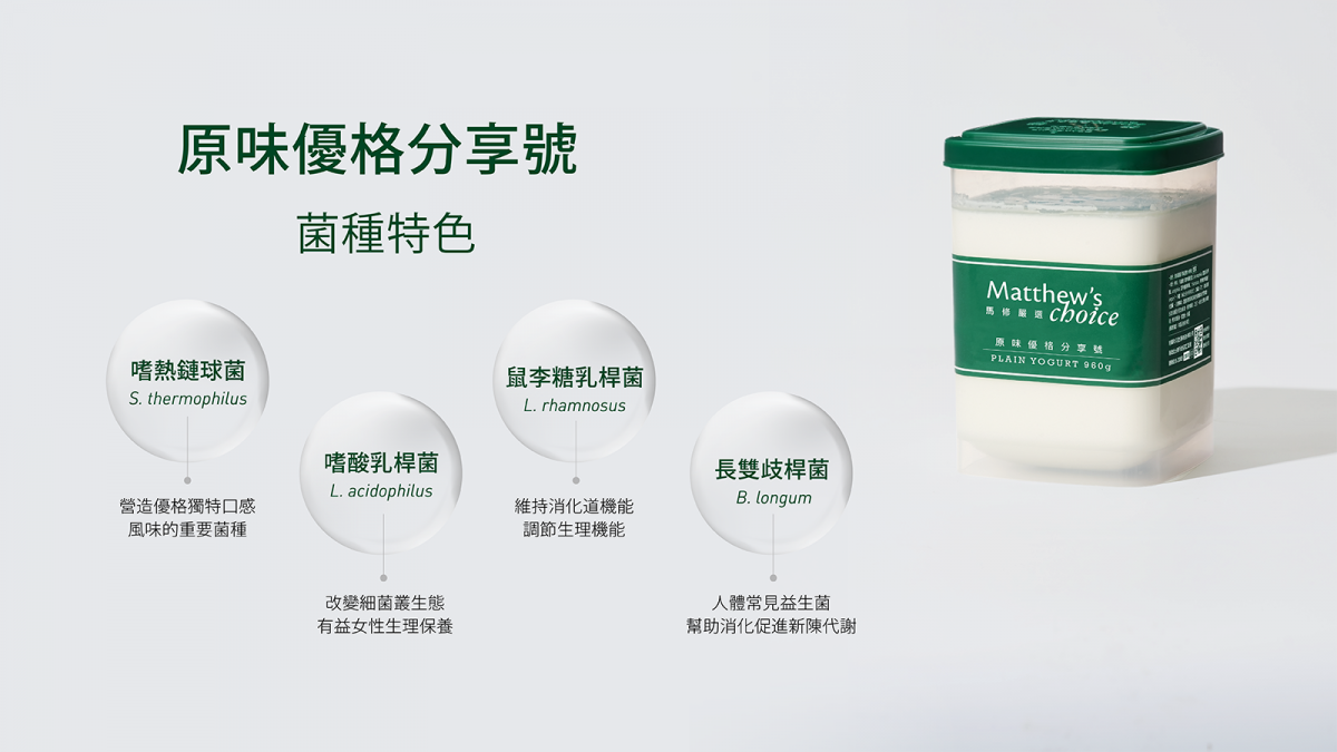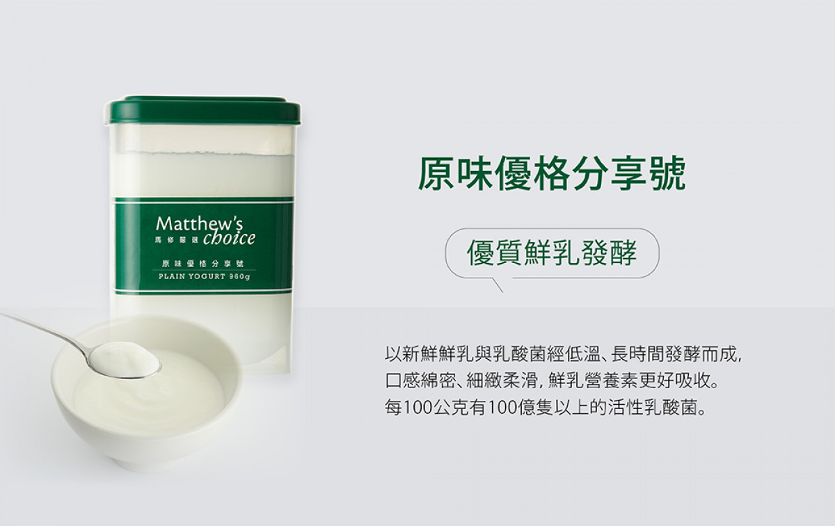 無加糖、無添加的鮮乳優格馬修嚴選最經典的鮮乳優格!以新鮮鮮乳與乳酸菌經低溫、長時間發酵而成,口感綿密、細緻柔滑,鮮乳營養素更好吸收。每100公克有100億隻以上的活性乳酸菌。✔保養等級:基礎✔菌種:四株✔風味:清爽微酸✔口感:綿密細緻柔滑✔適合族群:健康保健族