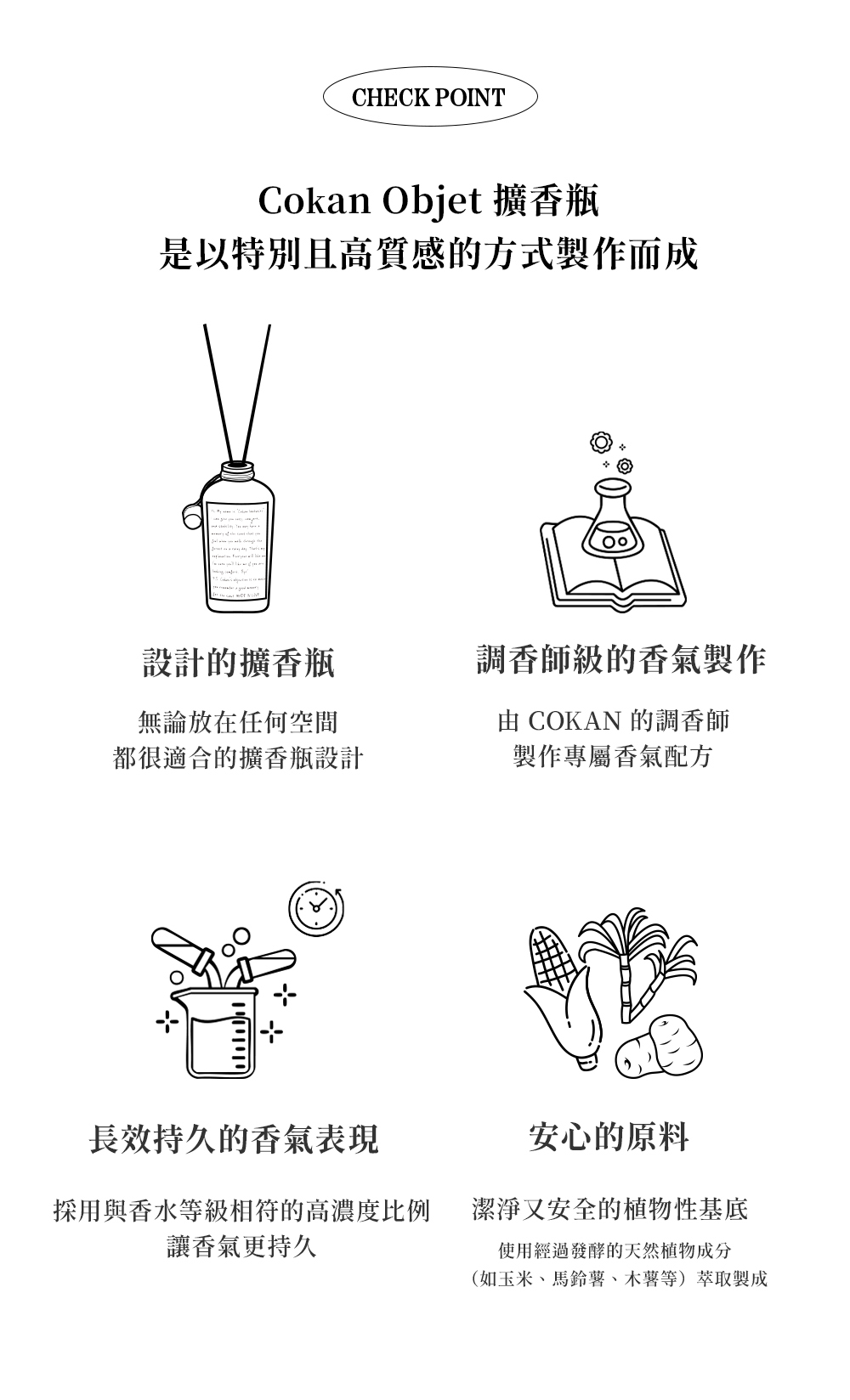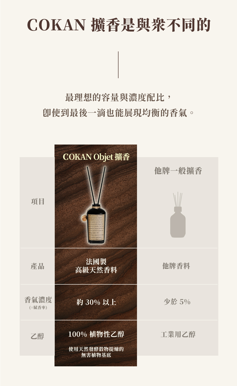 晚安你好夜裡,一瓶擴香讓房間慢慢變得安靜、溫柔、像重新整理過的生活來自 COKAN Objet 的香味,把森林、果實、木質、皮革、城市日常的記憶封進玻璃瓶裡無火、持久、乾淨,卻能悄悄地改變一個空間的氣氛。每一滴香氣都以法國高級香料 × 100% 植物性乙醇製作乾淨、安全、自然,也非常適合送禮這是一瓶會讓房間變更好的香味也是開始喜歡生活的一個小入口