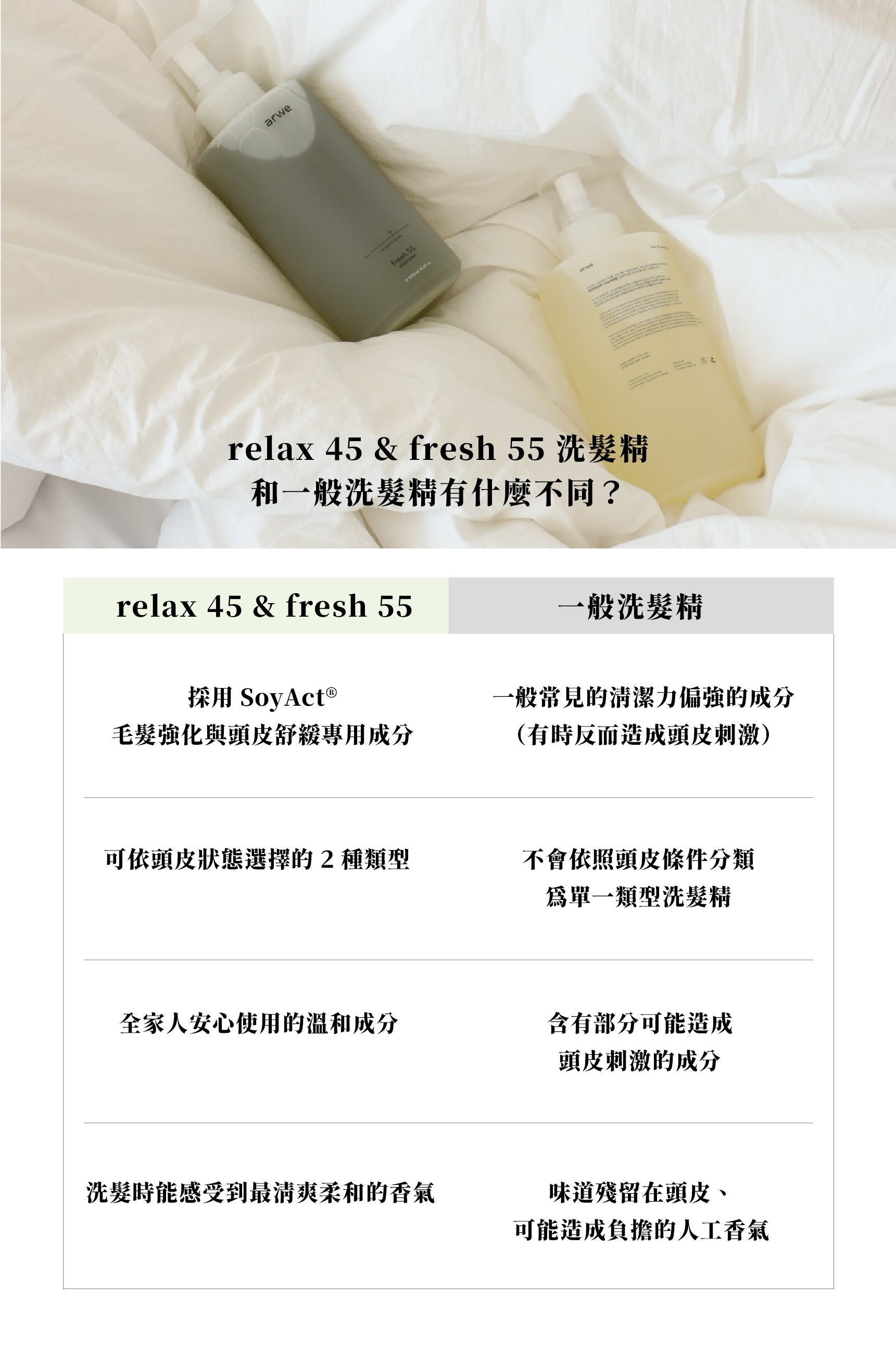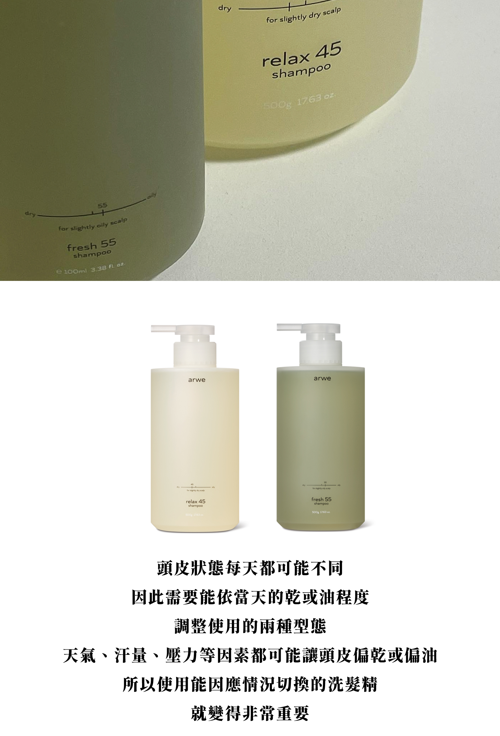 晚安你好乾燥、繃緊的頭皮,有時像需要一場雨Relax 45 以溫和草木氣息覆蓋每日累積的悶感在洗髮時釋放柔軟濕氣,讓髮絲吸飽舒緩與安定為敏弱與乾性頭皮設計的平衡配方讓每一次沖洗,都像把一天的雜音溫柔關掉-----------悶熱、易出油的頭皮,需要的是一道清爽的風。Fresh 55 以潔淨力剛好的植物配方在油脂堆積前重新整理頭皮的節奏洗後是輕盈、透氣、毫無負擔的清爽感讓容易塌、容易油的髮根重新站起來