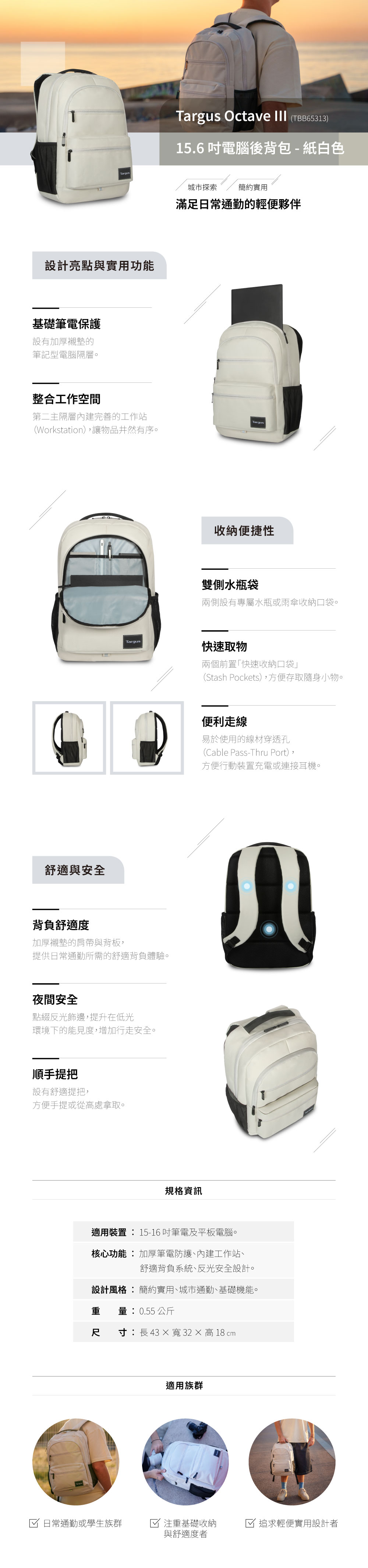 名稱:【Targus】Octave III 15.6吋電腦後背包-紙白色(TBB65313)