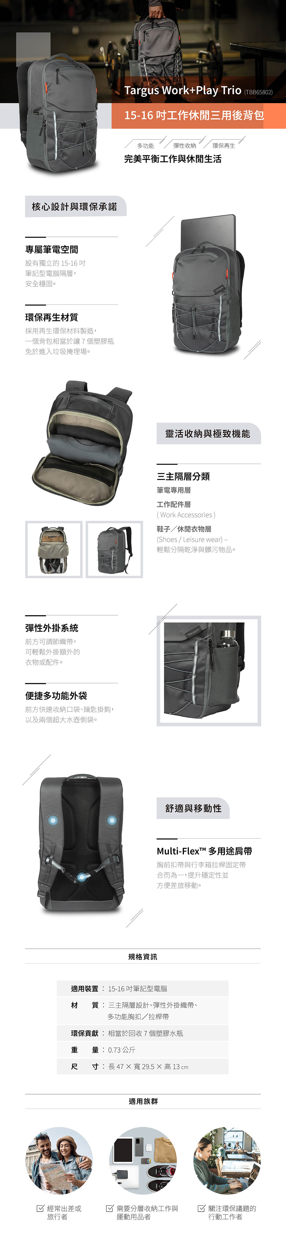 名稱:【Targus】Work+Play Trio 15-16吋 三合一多功能後背包-黑色(TBB65802)