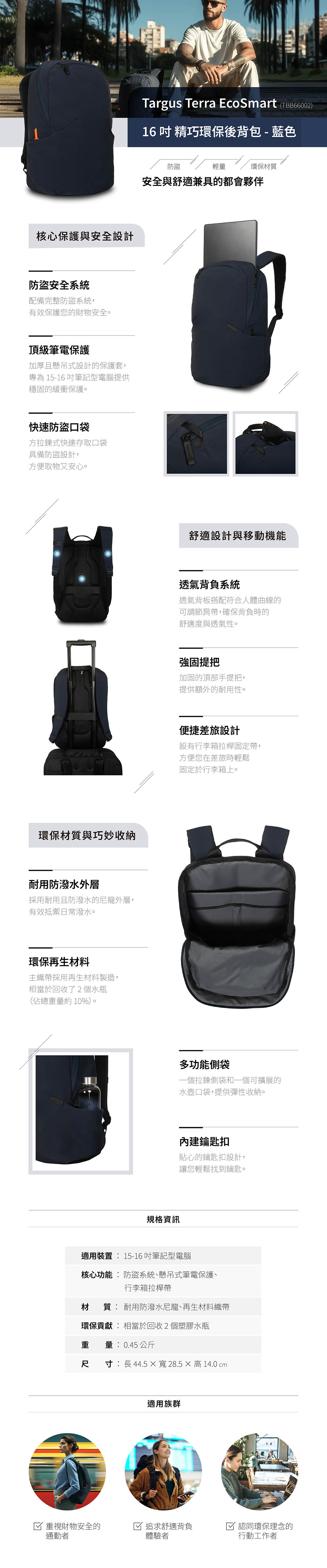 名稱:【Targus】Terra Compact 16吋 輕量環保筆電後背包-藍色(TBB66002)