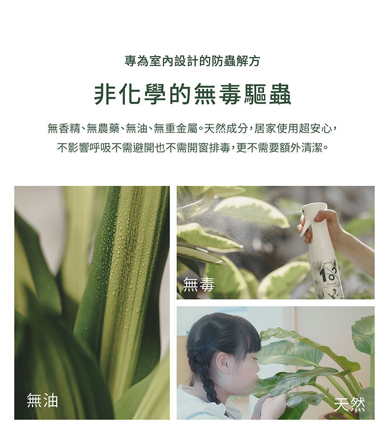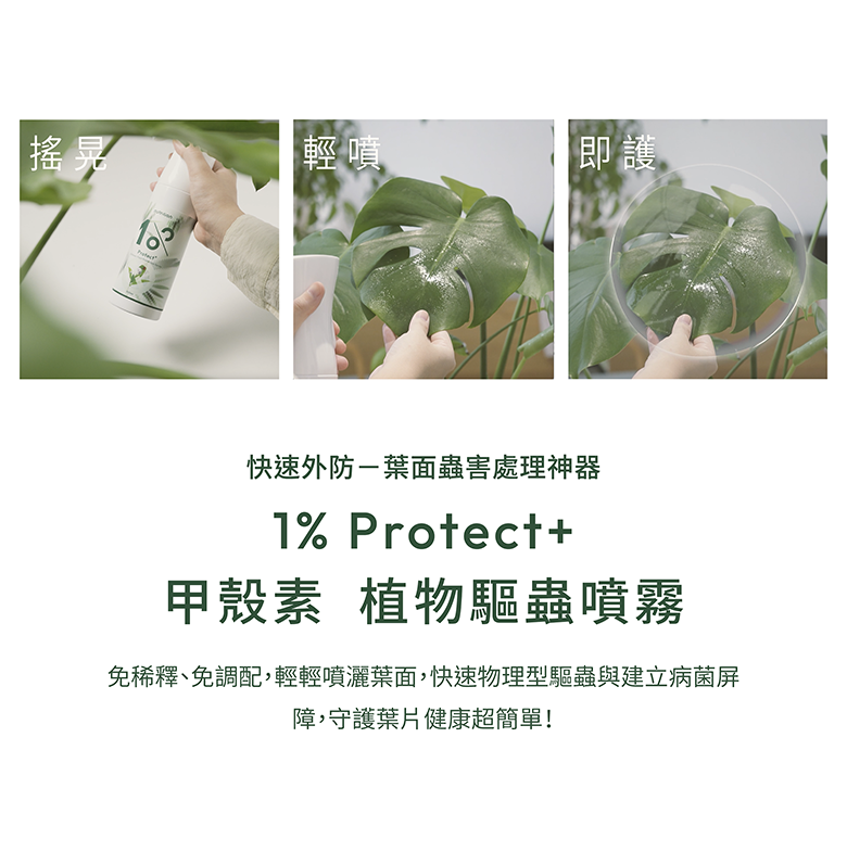 1% Protect+ 甲殼素植物驅蟲噴霧:成分|甲殼素免登記植保字號|植保製字第01246號產品規格|300 ml保存方式|未開封保存期限3年,開封後應儲存於陰涼處製造廠商|永綠生物科技股份有限公司地 址|高雄市前鎮區擴建路1之17號12樓電 話|07-9743776產 地|台灣