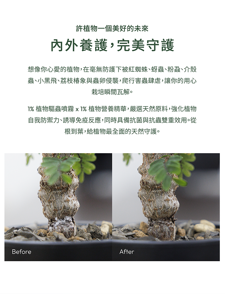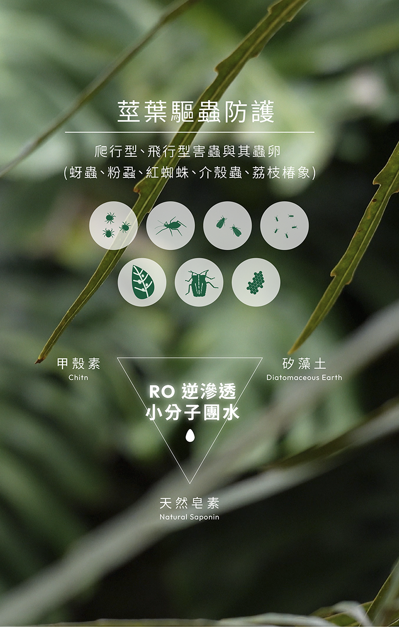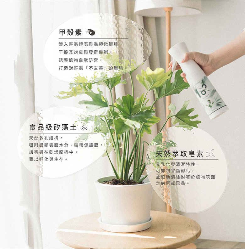1. 本產品含有天然甲殼素(來自蝦蟹來源),如對甲殼素過敏不適,使用時請配戴手套,避免直接接觸。若接觸後皮膚不適,請以清水沖洗並停止使用,必要時請諮詢醫師。2. 本產品成分溫和,pH值介於中性至弱酸性之間(約 6-7),使用時請視植株種類與生長狀態斟酌調整劑量、頻率,並提升通風,避免葉片積液影響效果。3. 細嫩新芽或斑葉、針葉、絨毛型葉面植物,因葉面較為敏感,建議先進行局部少量試用,觀察植物狀態後再全面施用。4. 如蟲害已控制或植物恢復健康,建議定期以清水或濕布擦拭葉面,協助植物代謝與光合作用。小提醒:矽藻土為天然有機防蟲資材,但還是會傷害部分有益昆蟲,請定點、針對性使用,勿隨意噴灑,我們並不希望蜜蜂、蝴蝶、蜻蜓、螳螂等也消失了。產品選用食品級矽藻土,但不宜吸入體內,特別是呼吸道疾病患者,使用時建議配戴口罩。