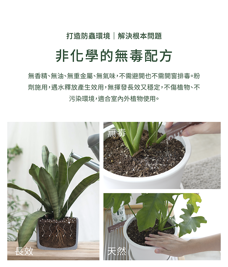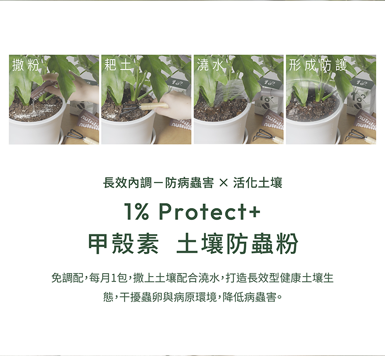 1% Protect+ 甲殼素土壤防蟲粉:成分|甲殼素、幾丁聚醣、食品級矽藻土、天然酵素群、二氧化矽免登記植保字號|植保製字第01330號產品規格|3g/包 x 20包保存方式|開封後應儲存於乾燥陰涼處製造廠商|永綠生物科技股份有限公司地 址|高雄市前鎮區擴建路1之17號12樓電 話|07-9743776產 地|台灣