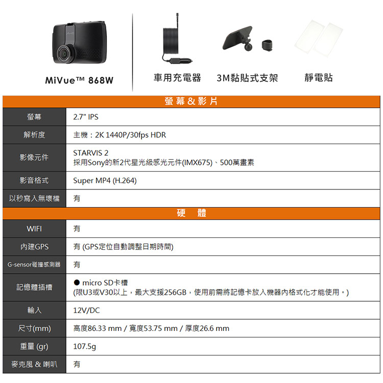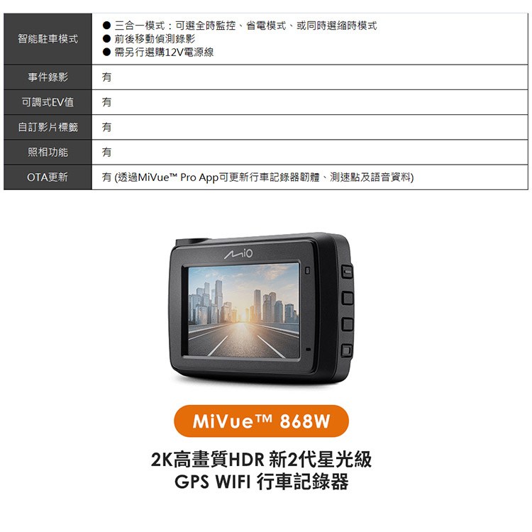 品名:Mio MiVue 868W GPS WIFI 2K 行車記錄器