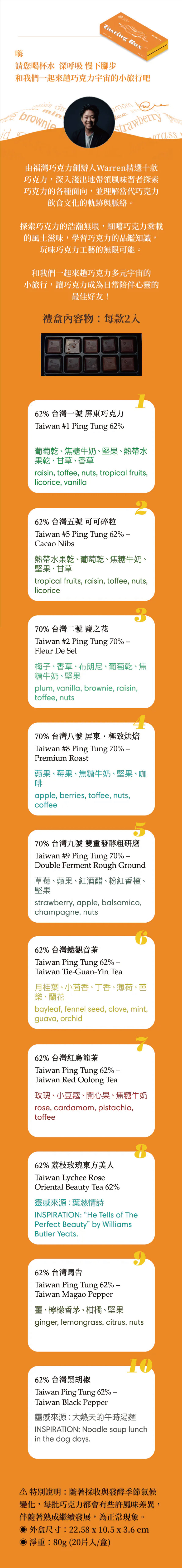 *特別說明:隨著採收與發酵季節氣候變化,每批巧克力都會有些許風味差異,伴隨著熟成繼續發展,為正常現象。外盒尺寸:22.58*10.5*3.6cm淨重:80g(20片入/1盒)