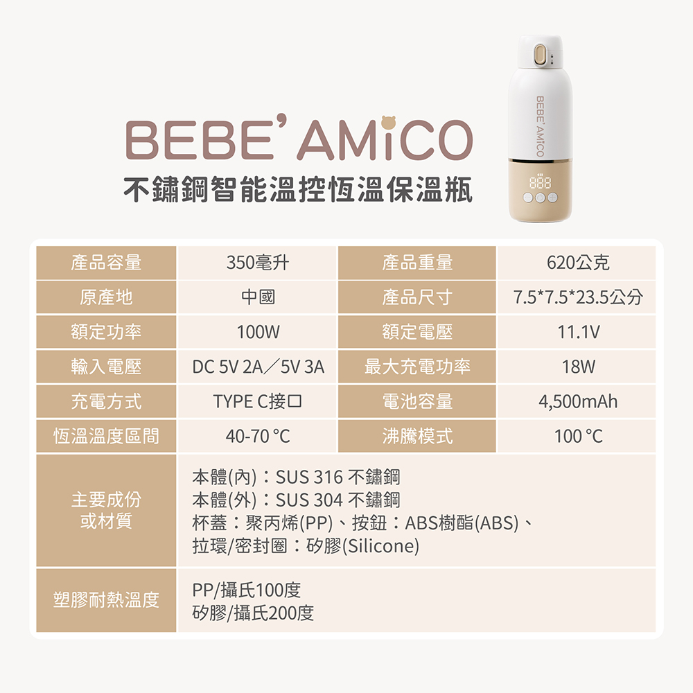 保溫瓶商品規格:品名: 不鏽鋼智能溫控恆溫保溫瓶350ml貨號: BAF11308.11國際條碼: 4719961380255尺寸:8x8x23公分重量:約620克額定功率/電壓:100w、11.1V輸入電壓:Type C接口,DC 5V/2A、5V/3A電池容量:4,500mah