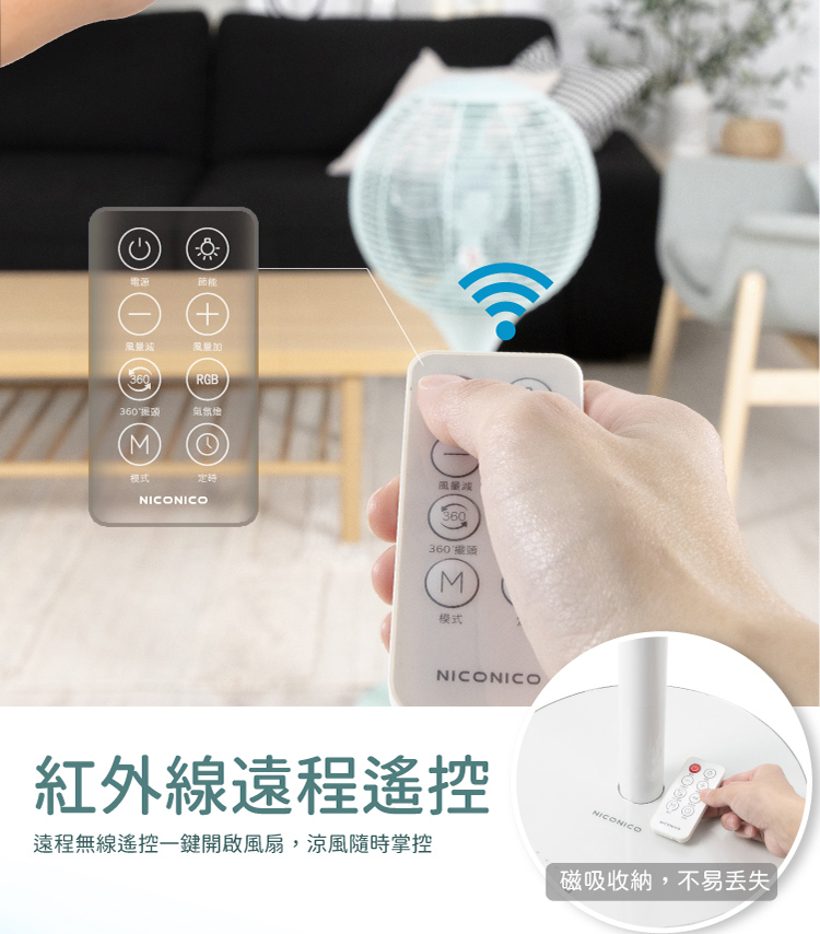 商品特色🔺360度環繞送風,12段風速可調 🔺ECO智慧溫控,自動偵測室溫調整風速 🔺LED微電腦觸控面板,可無線遙控 🔺四種風量模式(正常、自然、睡眠、ECO) 🔺DC直流馬達節能省電 🔺智能定時可達8小時 🔺120mm高度可自由調整 🔺炫彩夜燈設計,打造輕鬆氛圍商品規格品牌:NICONICO品名:360度球形DC遙控美型立扇 型號:NI-S2011 額定電壓:110V 額定頻率:60Hz 總額定消耗電功率:20w 淨重:約2.9Kg 降下尺寸:320x320x800mm 外觀尺寸:320x320x920mm 遙控器電池規格:CR2025 3V 配件:遙控器x1 產地:中國BSMI標準檢驗局認證字號:R3C302
