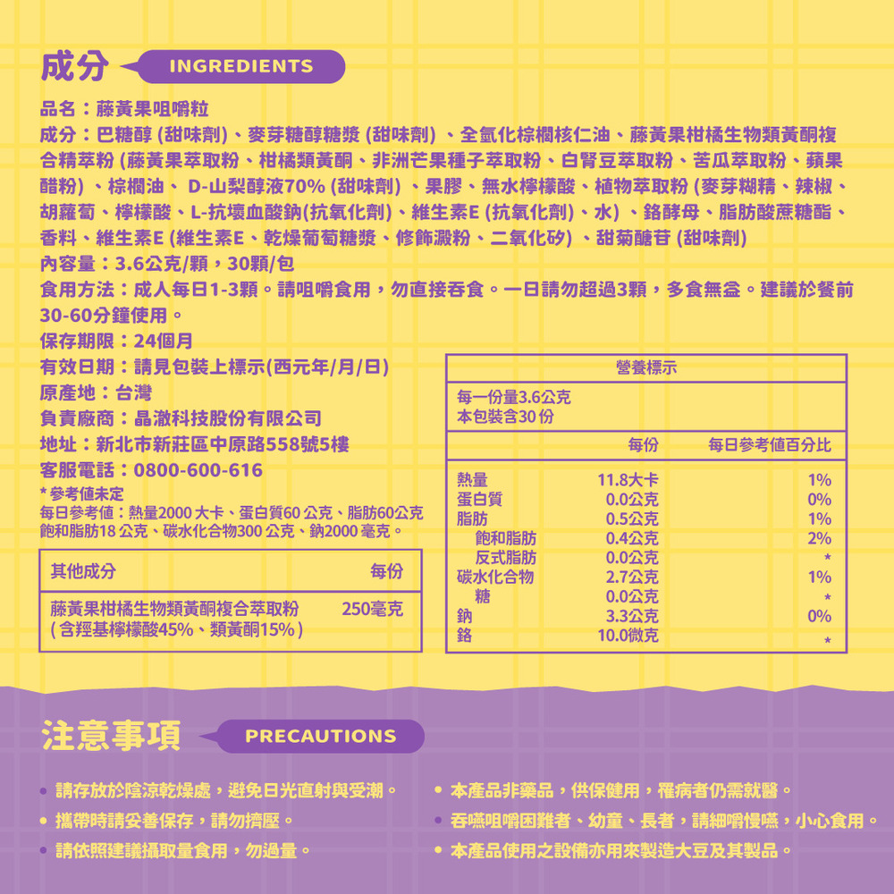 內容物成分:巴糖醇 (甜味劑)、麥芽糖醇糖漿 (甜味劑) 、全氫化棕櫚核仁油、藤黃果柑橘生物類黃酮複合精萃粉 (藤黃果萃取粉、柑橘類黃酮、非洲芒果種子萃取粉、白腎豆萃取粉、苦瓜萃取粉、蘋果醋粉) 、棕櫚油、 D-山梨醇液70% (甜味劑) 、果膠、無水檸檬酸、植物萃取粉 (麥芽糊精、辣椒、胡蘿蔔、檸檬酸、L-抗壞血酸鈉(抗氧化劑)、維生素E (抗氧化劑)、水) 、鉻酵母、脂肪酸蔗糖酯、香料、維生素E (維生素E、乾燥葡萄糖漿、修飾澱粉、二氧化矽) 、甜菊醣苷 (甜味劑)
