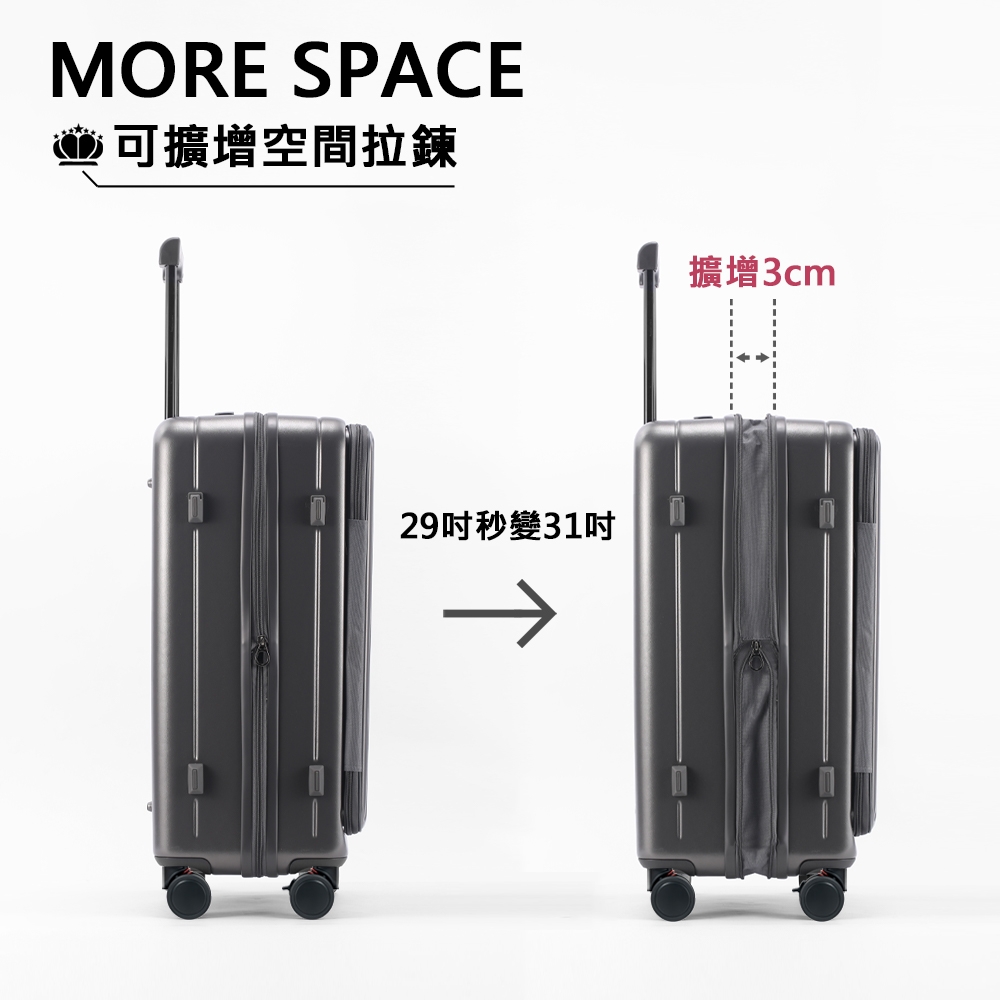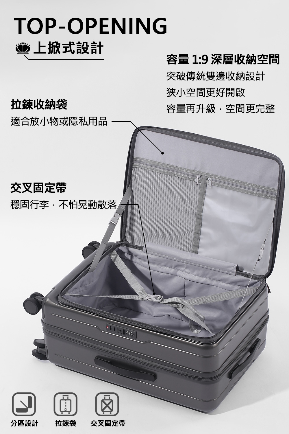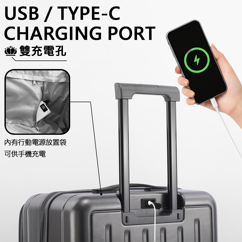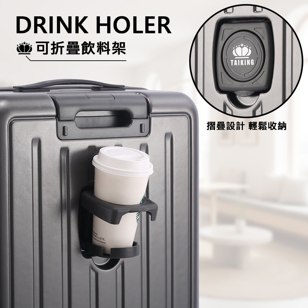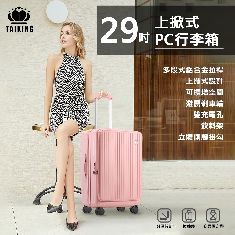 29吋 TAIKING 上掀式 PC行李箱 多段式鋁合金拉桿/上掀式/可擴增空間/避震剎車輪/雙充電孔/飲料架/立體側腳掛勾