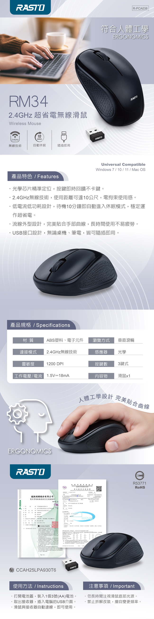 .BSMI識別碼:R53771 .NCC 證書號: CCAH25LPA930T6.自動省電休眠,待機 10 分鐘自動休眠,延長電池壽命.1200 DPI 精準定位,滑動順暢、反應即時.人體工學握感,舒適貼合手型,久握不累.靜音按鍵,深夜辦公不擾人.USB 隨插即用,免驅動,一插就能用.輕巧便攜,辦公、居家、學生皆適用.2.4GHz穩定無線技術,連線快、干擾少,距離遠達 10 公尺